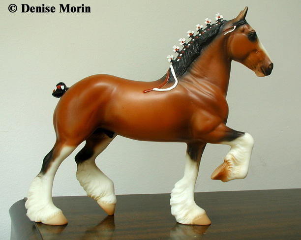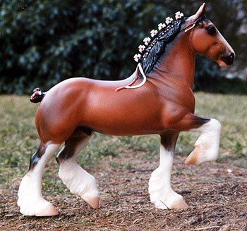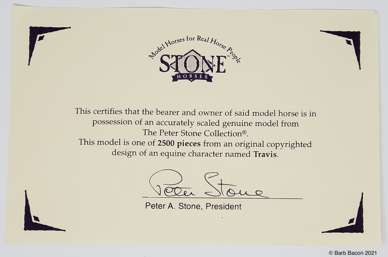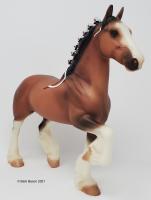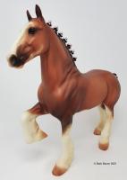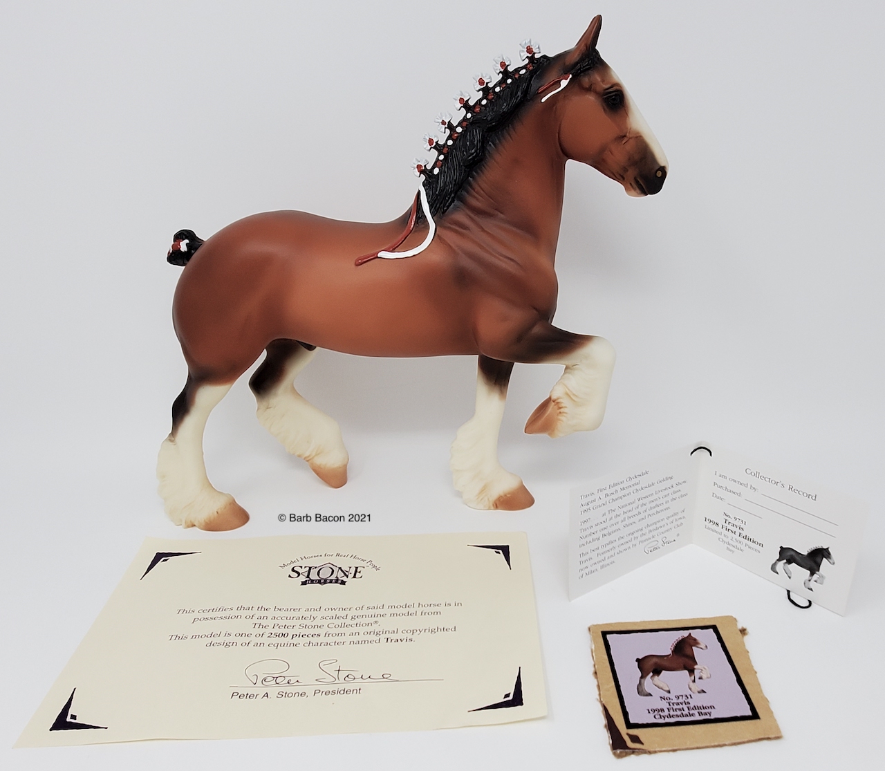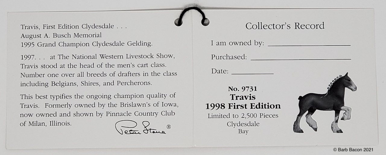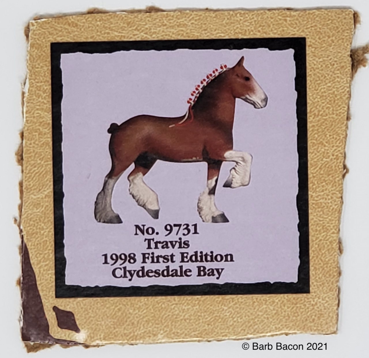 Travis is the First Edition that was produced on the trotting drafter model. He has a few known variations, one is on the pre-release version where his bobs are painted top white, bottom red. The regular release Travis has bobs that are entirely white with a small red center. Another variation consists of no black on his knees or hocks. Being a first edition model, Travis was limited to 2500 pieces. Travis was first advertised in the 1997 manual, however he wasn't officially produced until 1998.
