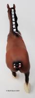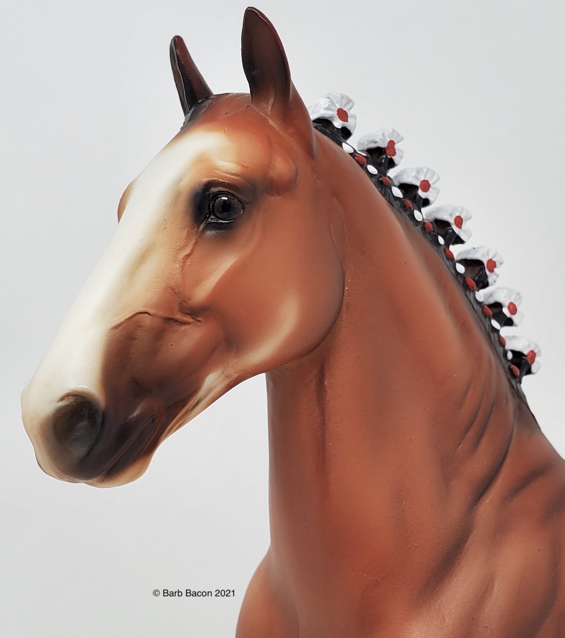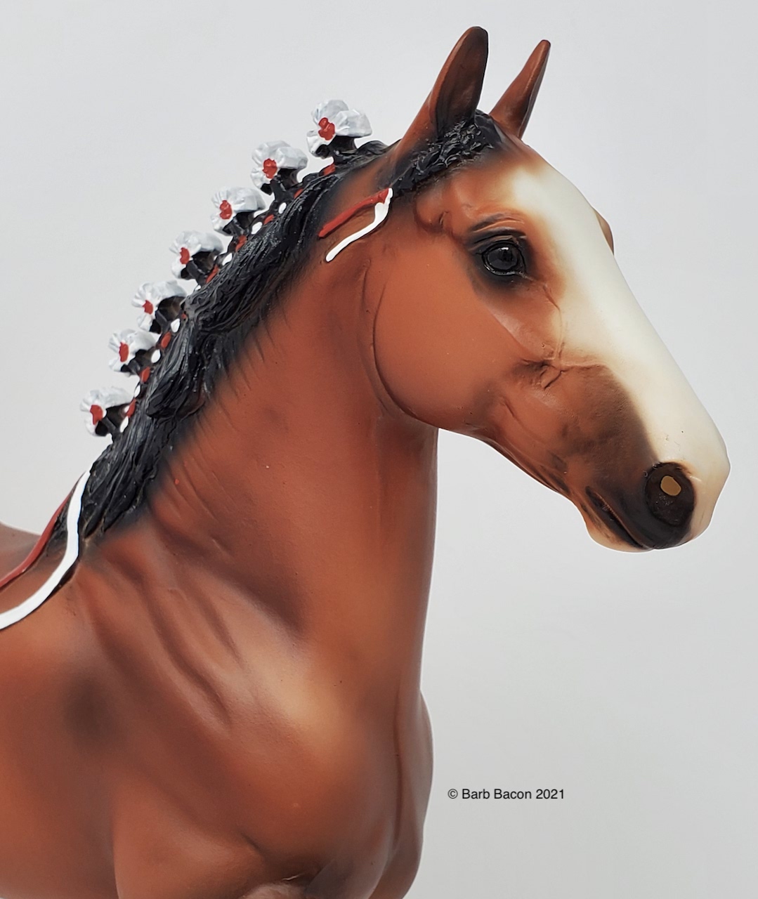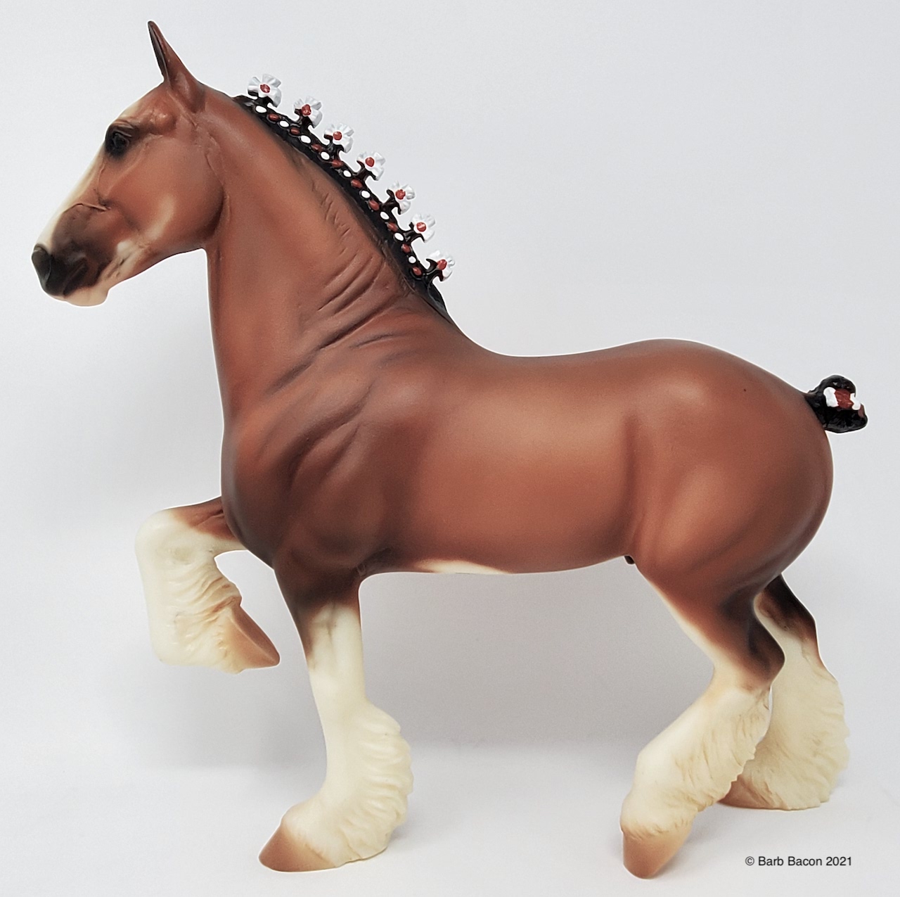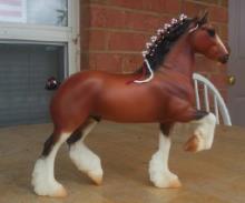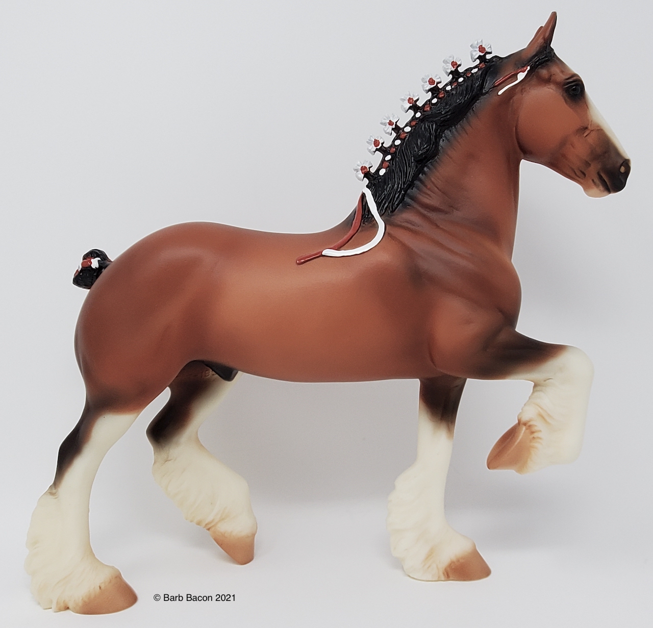 Travis is the First Edition that was produced on the trotting drafter model. He has a few known variations, one is on the pre-release version where his bobs are painted top white, bottom red. The regular release Travis has bobs that are entirely white with a small red center. Another variation consists of no black on his knees or hocks. Being a first edition model, Travis was limited to 2500 pieces. Travis was first advertised in the 1997 manual, however he wasn't officially produced until 1998.