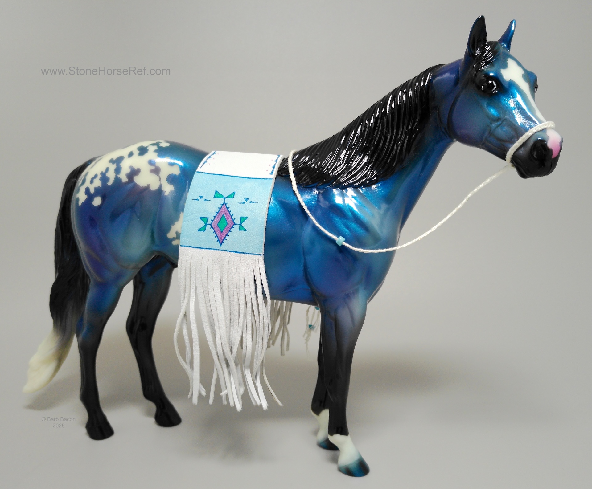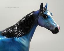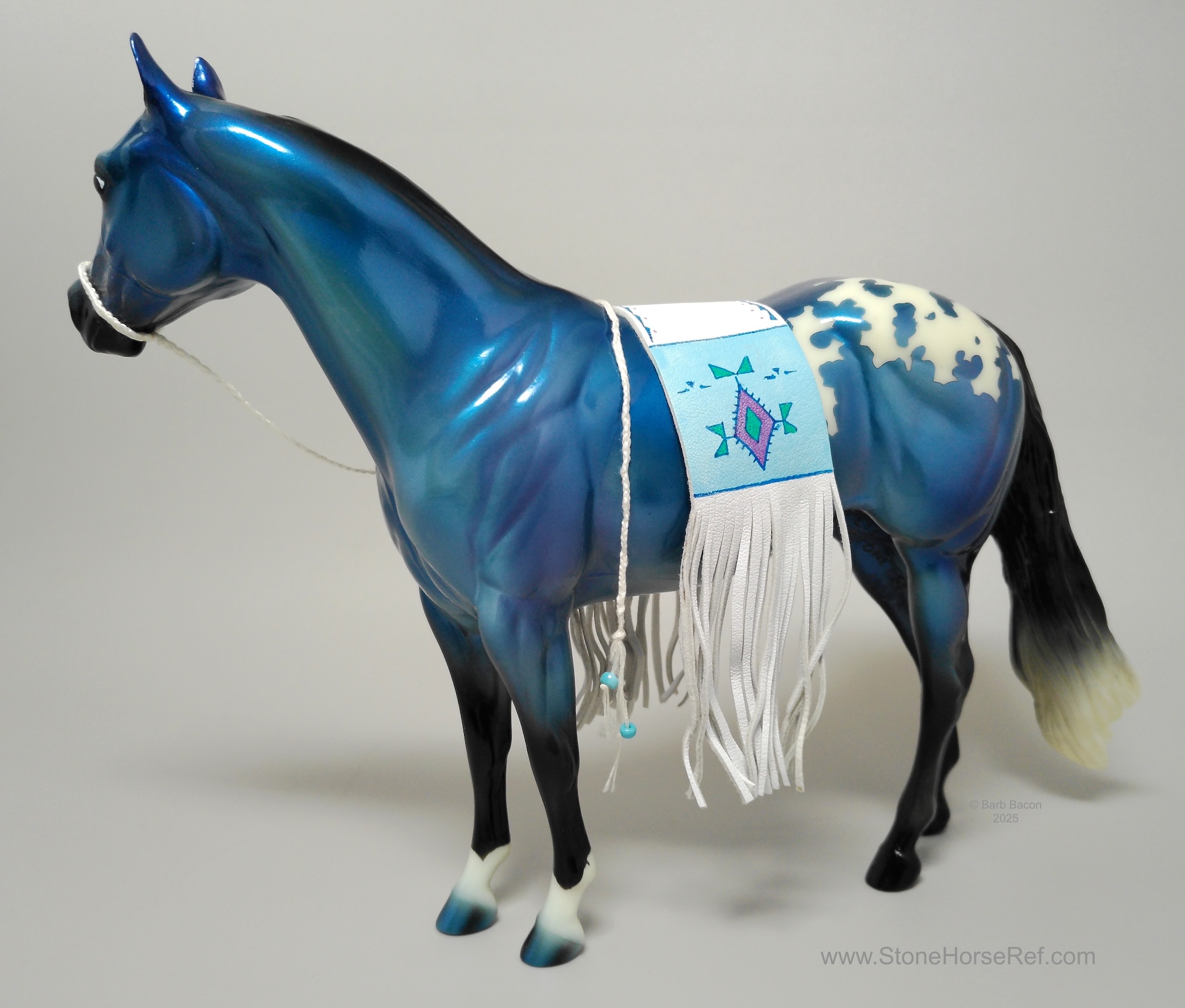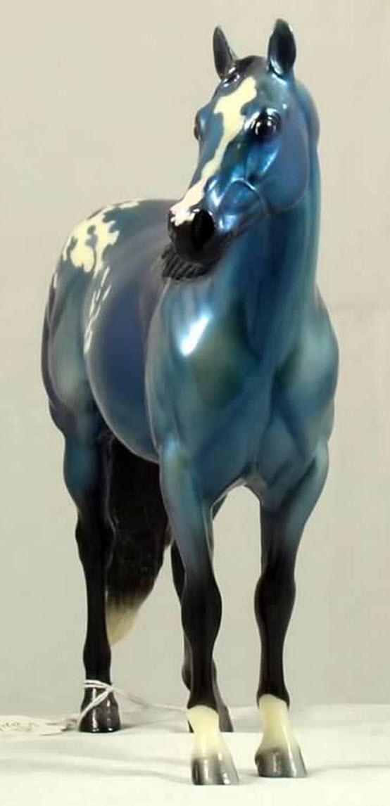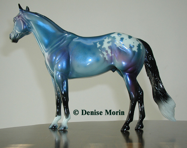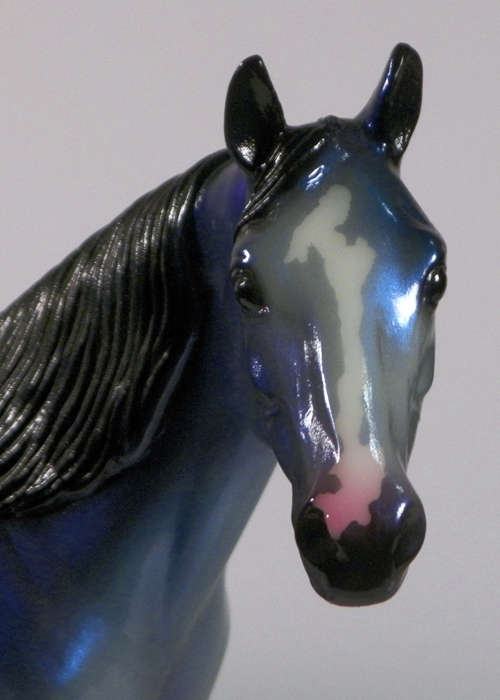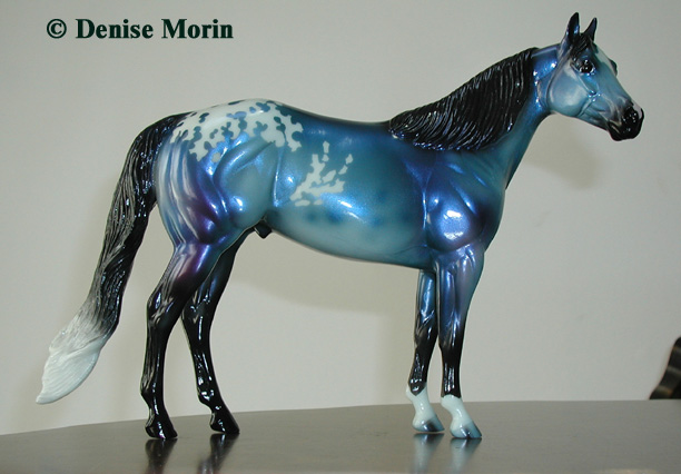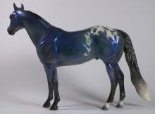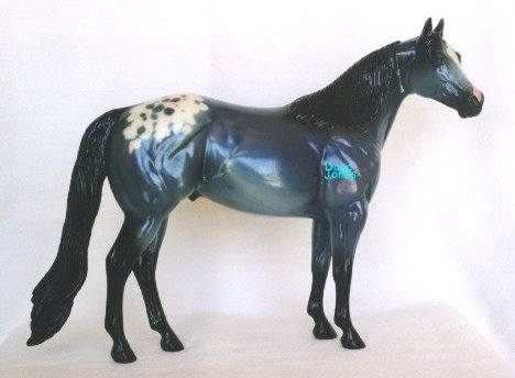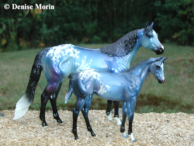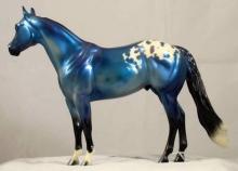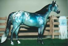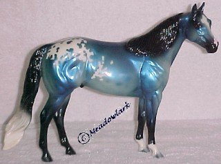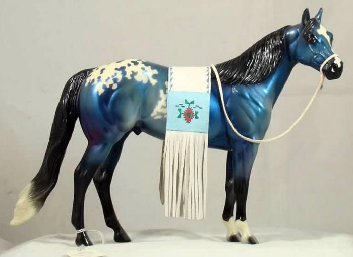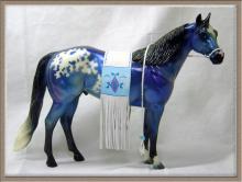 The Mohawk Indian Princess Horse designed by Karen Gerhardt - available by lottery ONLY and limited to 200 horses. There are 25 pre-production models as well, with hind socks instead of front socks and a different blanket pattern and nose blazes. Also pictured is a photo of Little Bird and Fledgling. Fledgling was introduced as a special run of 225 at Equilocity 2002.