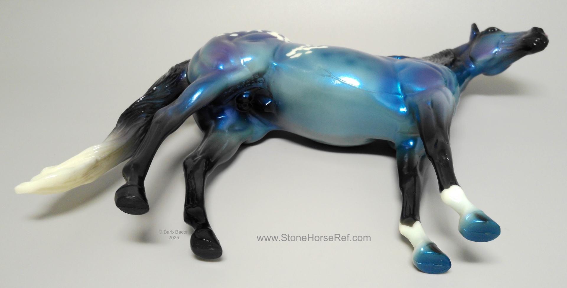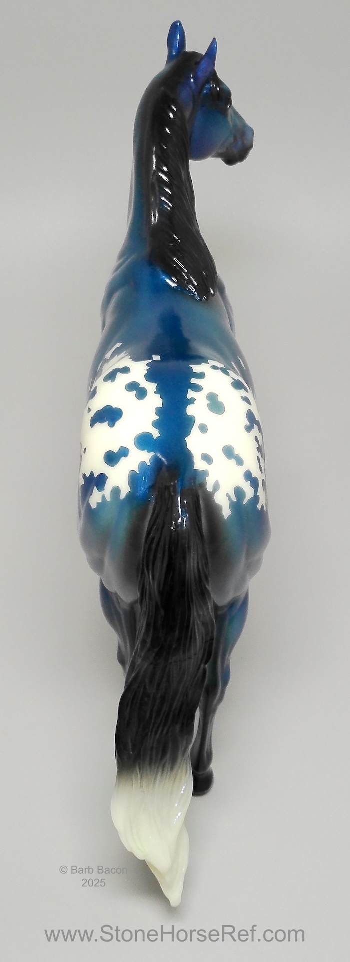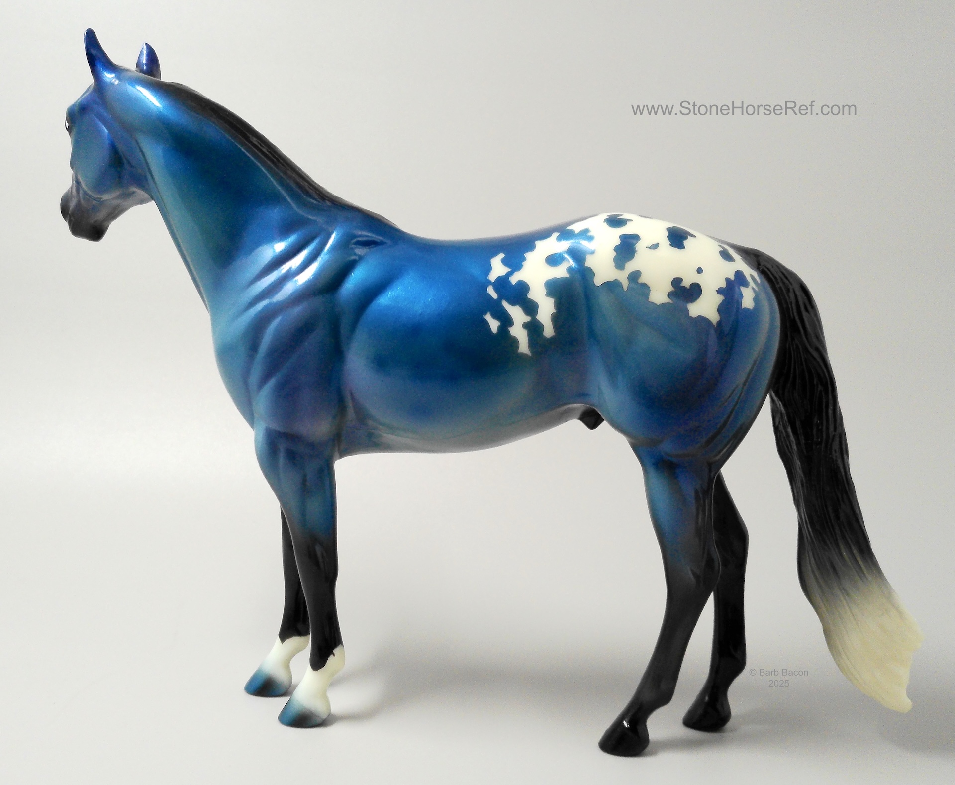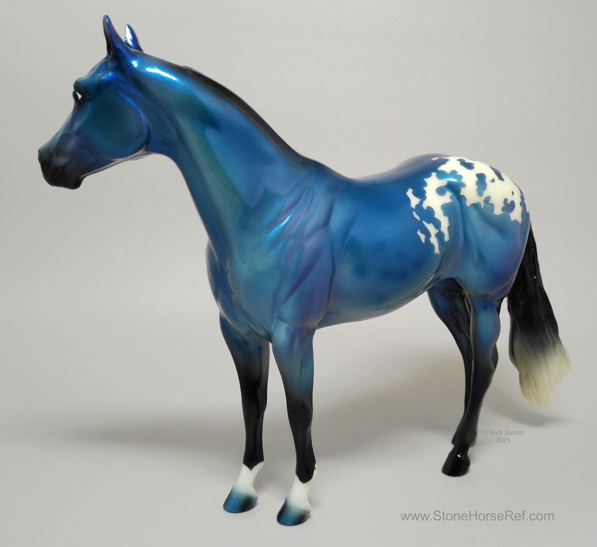 The Mohawk Indian Princess Horse designed by Karen Gerhardt - available by lottery ONLY and limited to 200 horses. There are 25 pre-production models as well, with hind socks instead of front socks and a different blanket pattern and nose blazes. Also pictured is a photo of Little Bird and Fledgling. Fledgling was introduced as a special run of 225 at Equilocity 2002.