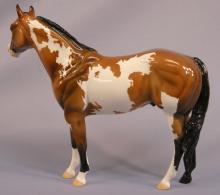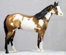 This is a One-of-Two Ideal Stock Horse. Painted a fancy Sooty Buckskin Paint and a glossy finish, he has a custom mane and forelock, and a swishing tail sweeping back under himself.