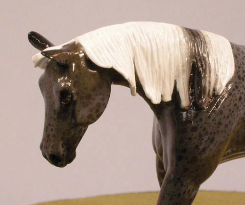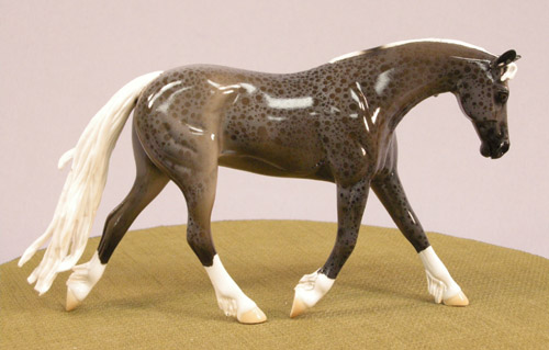 This is a One of a Kind Pebbles Warmblood. Painted in a speckled Dapple Gray with white mane and tail, he is customized with leg feathers, a sculpted long mane, and a remade tail with added details. Done in a glossy finish.