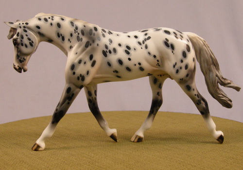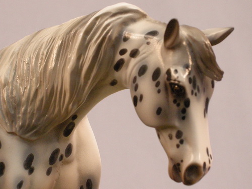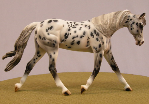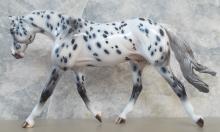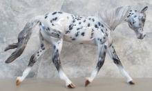 Ashes - Limited run of 5 Pebbles Warmbloods created for Equilocity. They are painted in a Leopard Appaloosa pattern with striped hooves, haloed spots, a shaded mane and tail, and pink mottled skin. They are customized with a remade, long, loose mane, and a swishing tail with added details.