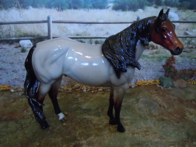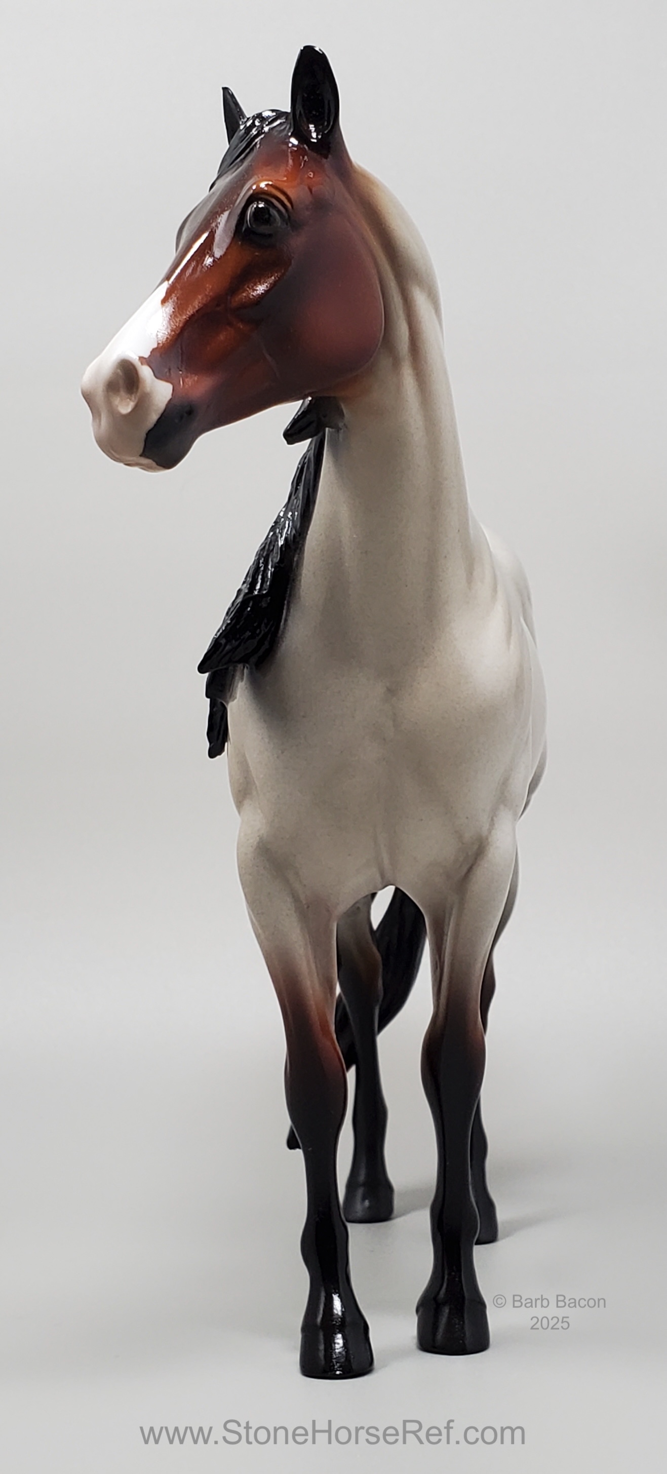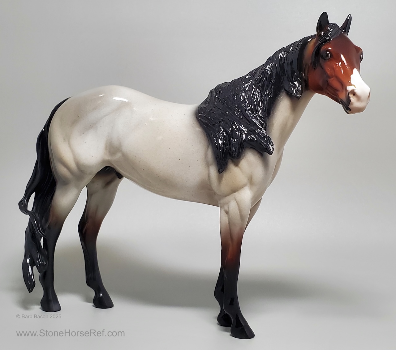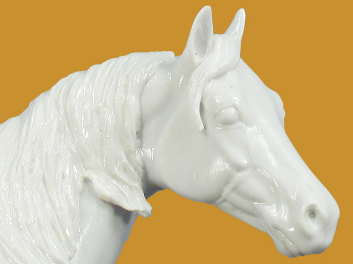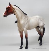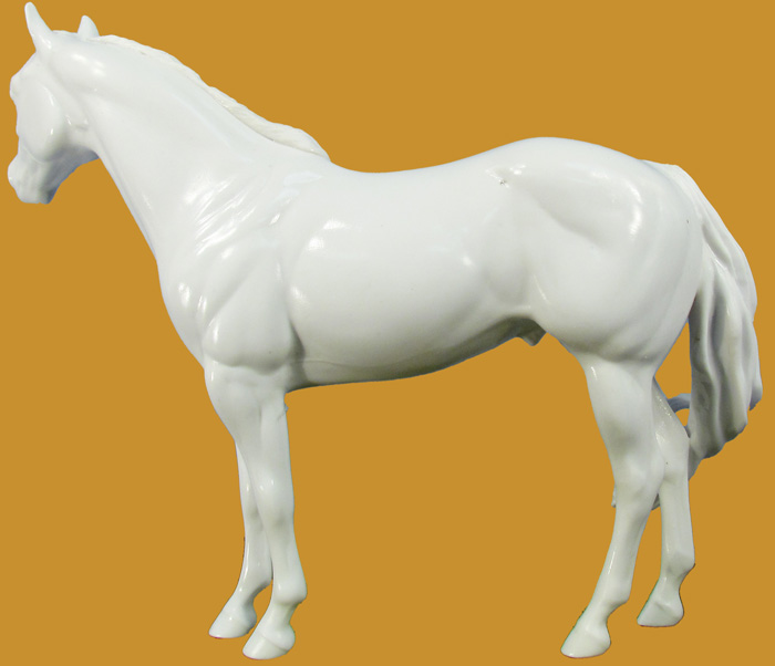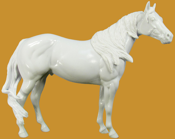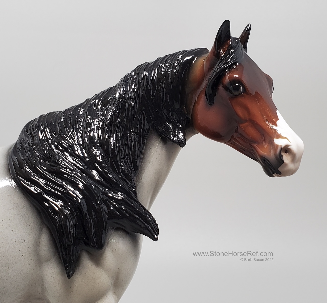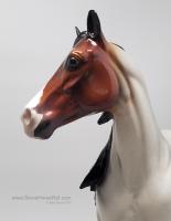 This Stock Horse has carved ears and nose detail, a sculpted forelock, a windswept mane, and a remade long swishing tail. Available on any of the available Design A Horse colors and patterns.