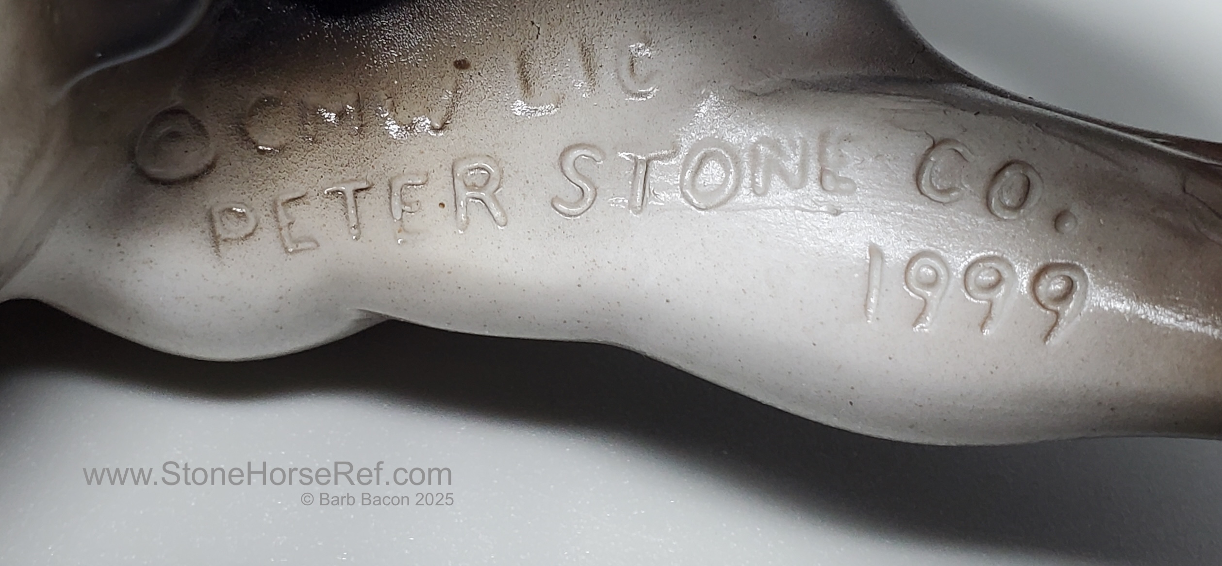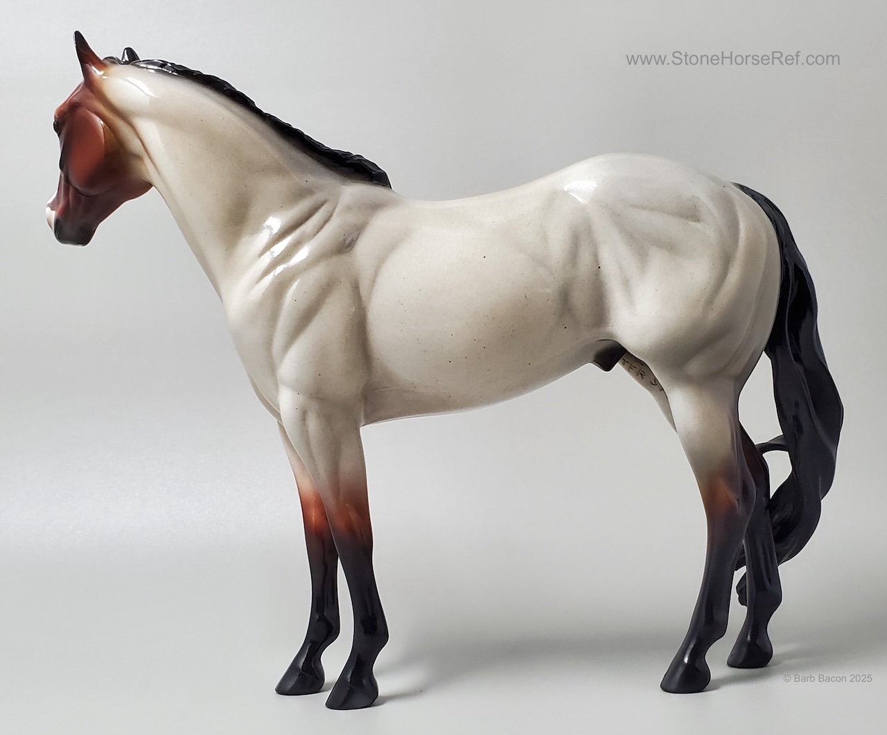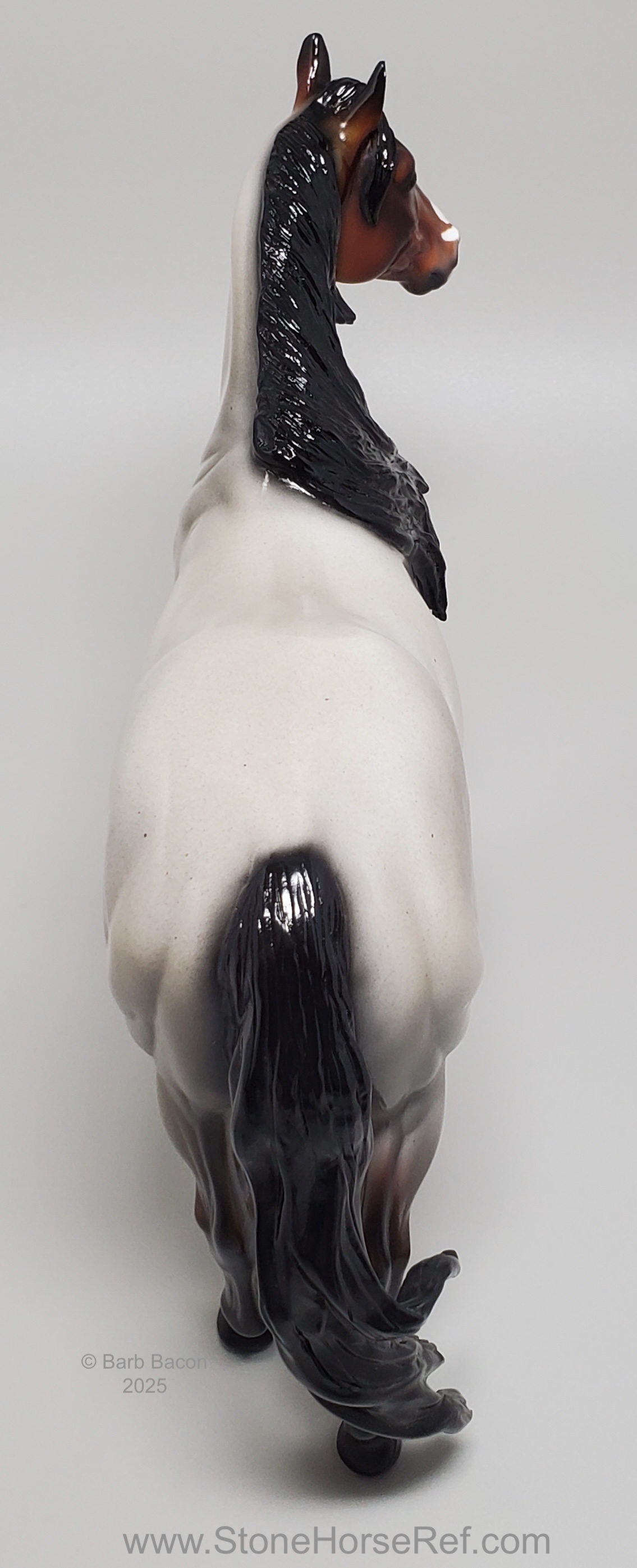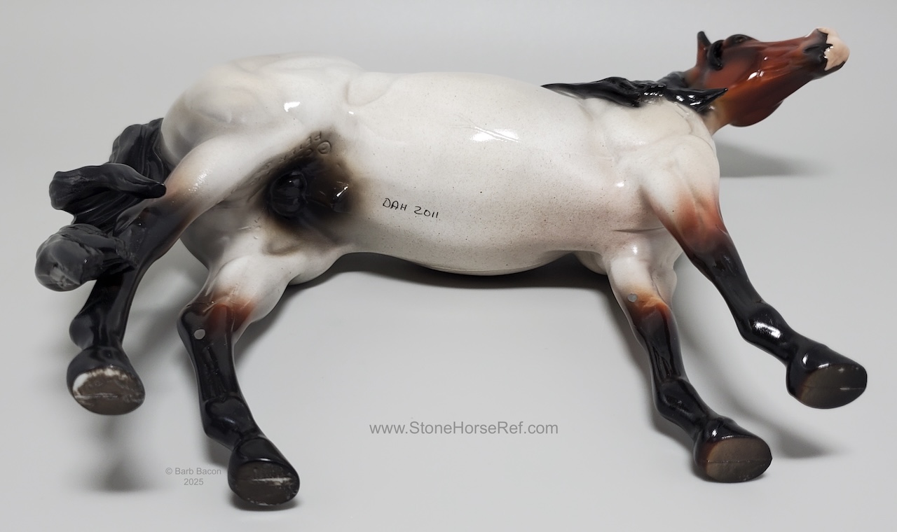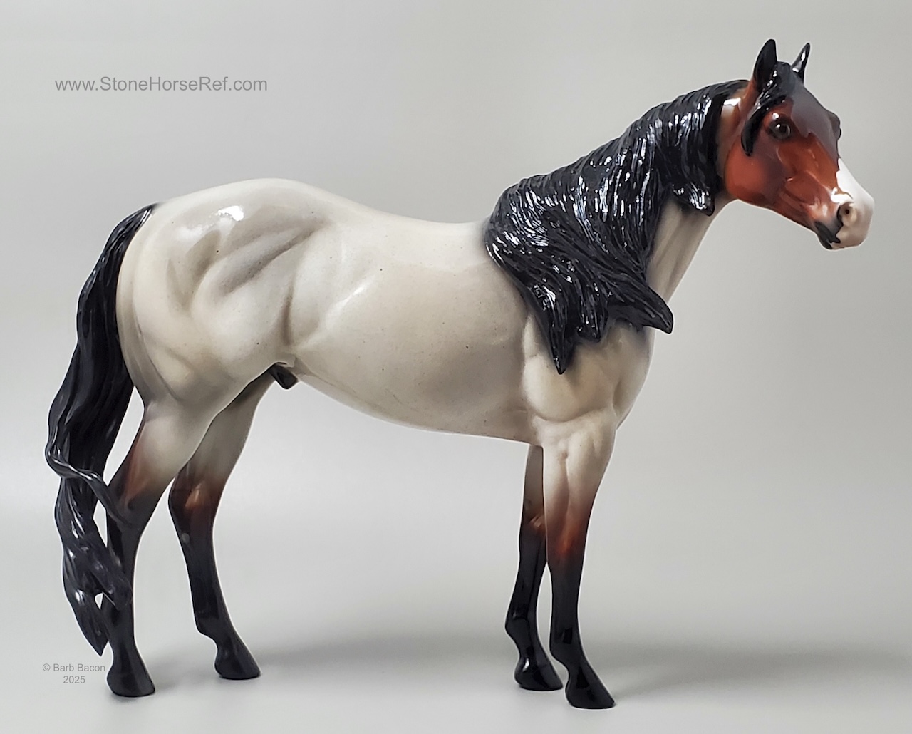 This Stock Horse has carved ears and nose detail, a sculpted forelock, a windswept mane, and a remade long swishing tail. Available on any of the available Design A Horse colors and patterns.