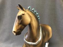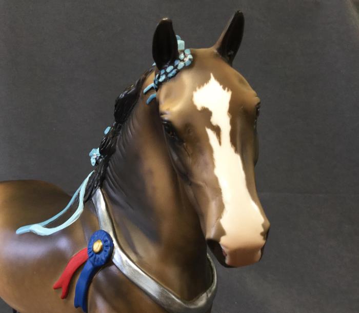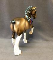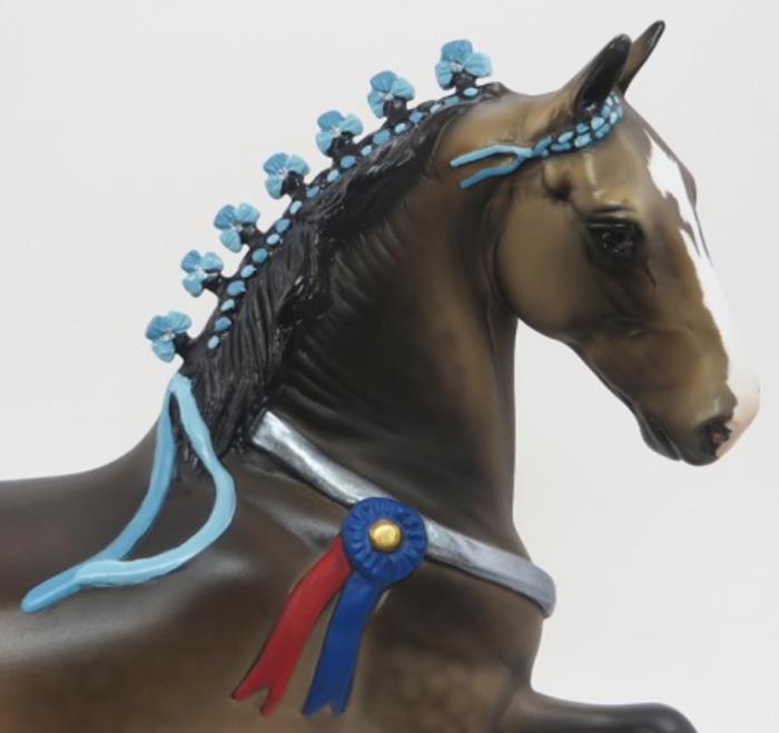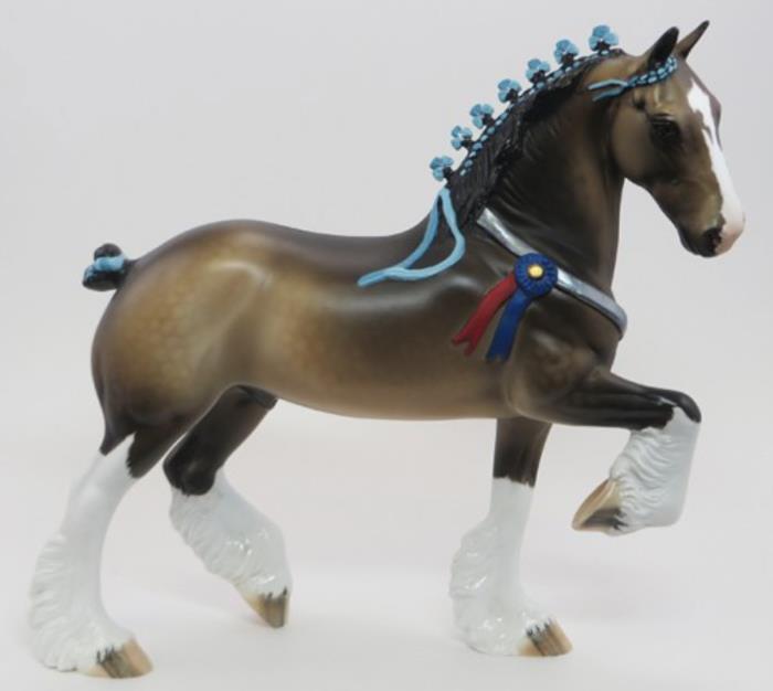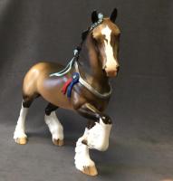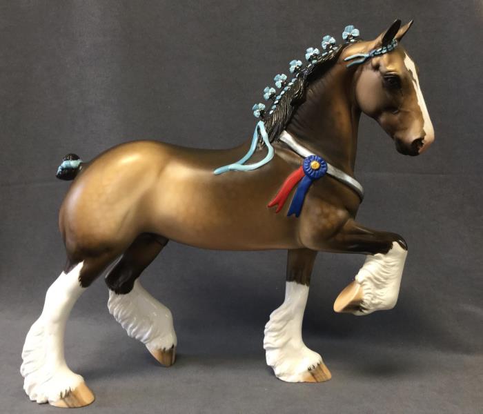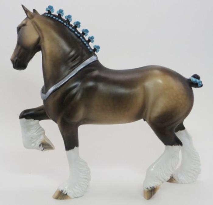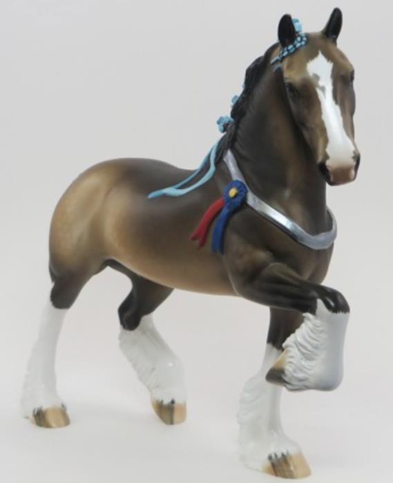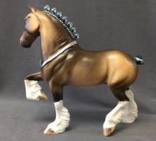 FARLEY - Custom Trotting Drafter, Dapple Buckskin, Slightly Turned Head, Neck Ribbon, Carved Ears, Nose and Jaw, Hoof Stripes, 9/18. Hand Crafted in Shipshewana, IN.