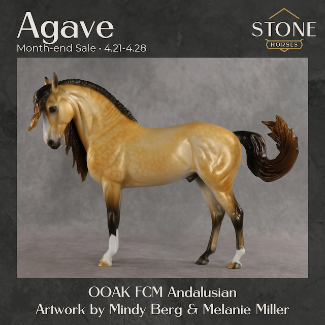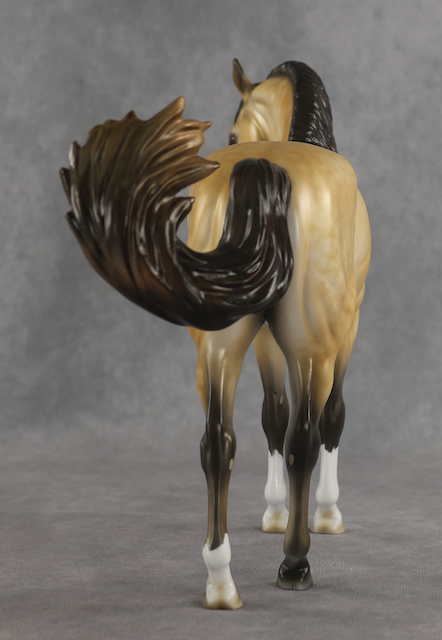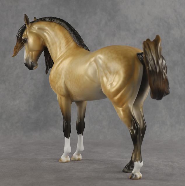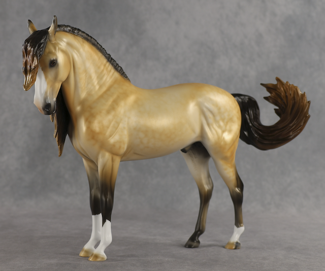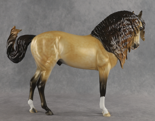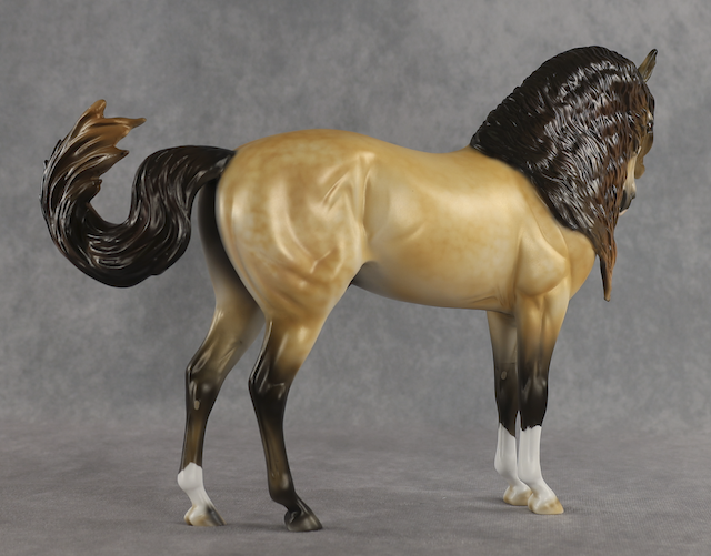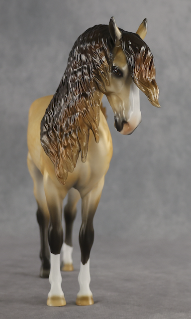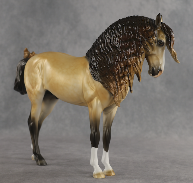 Agave - OOAK Dapple Buckskin Andalusian, Custom Turned and Tucked Head, Custom Long Wavy Mane, Forelock and Swished Tail, Satin Matte Finish, Customized by Melanie Miller, Painted by Mindy Berg. Auction Reserve of $1150.
