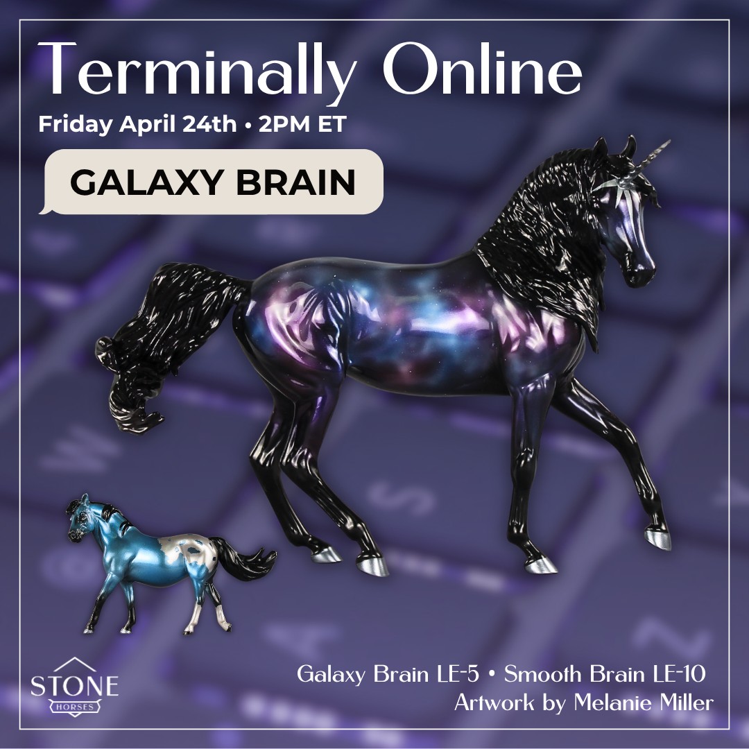 Galaxy Brain - Limited Edition of 5, Galaxy Inspired Decorator Arabian Mare Customized as a Unicorn with Clear Horn, Turned and Tucked Head, Long Wavy Mane, Forelock and Swished Tail, Star Face Marking Framing the Horn, Etched Starry Eyes, Glossed, Painted and Customized by Melanie Miller. Inspired by the Galaxy Brain Meme. April 2026 Terminally Online Series.
