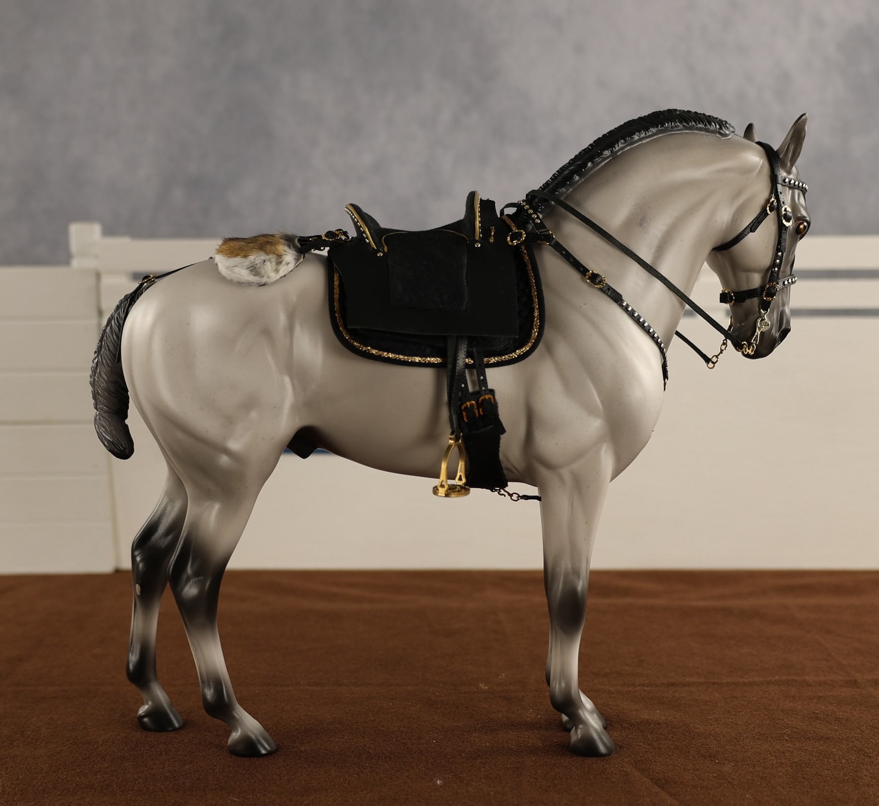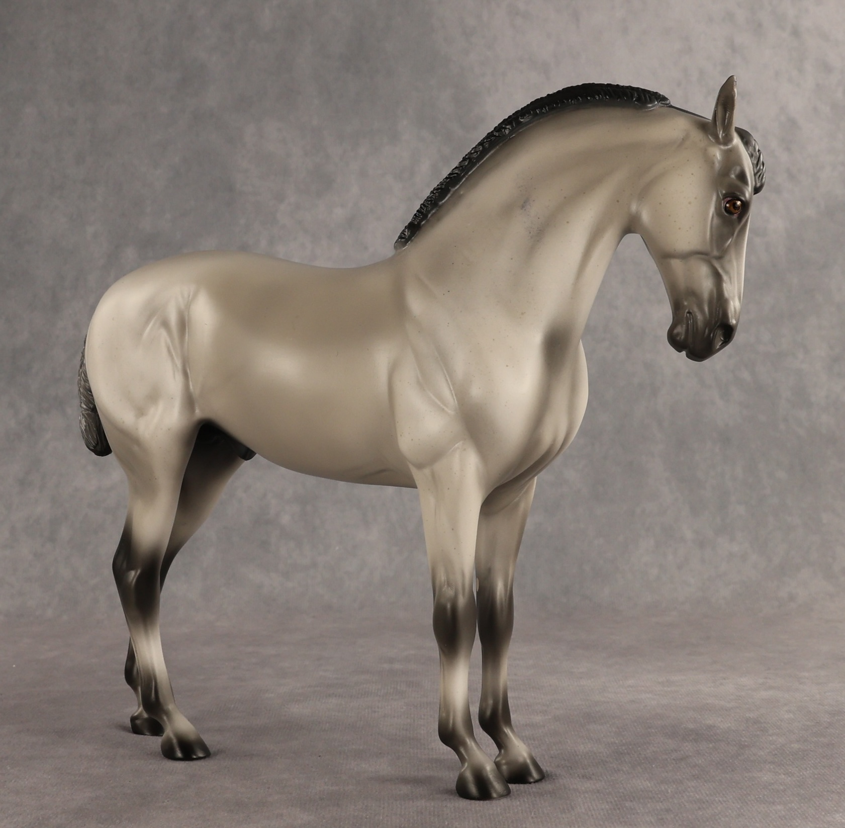 Valen - Limited Edition of 15, Flea-Bit Grey Andalusian, Custom Turned and Tucked Head, Custom Braided Mane, Forelock and Mud Knot Tail, Customized by Matt Samuels, Painted by Anna Rieck.