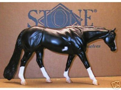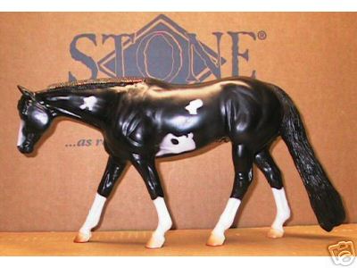 This black pinto Western Pleasure Horse was a special run produced by the Peter Stone Company for Back in the Saddle in 1999. It was painted with the old style masking techique which gives the markings soft edges.
