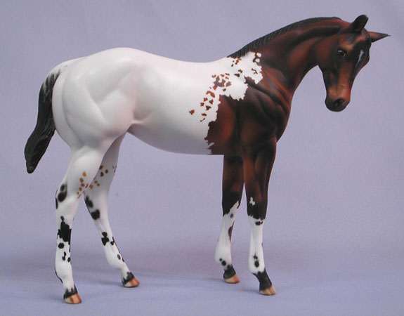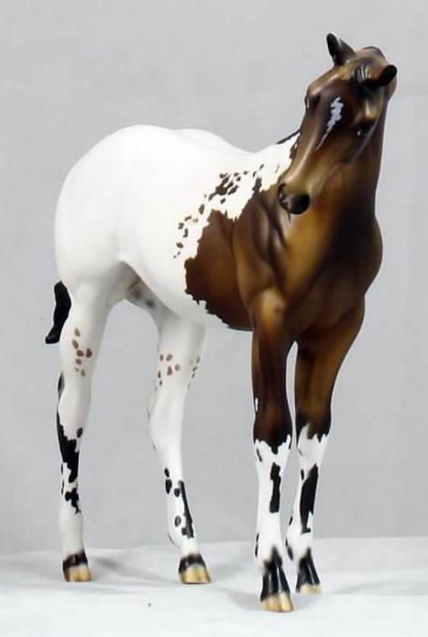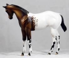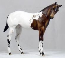 Baby Houdini, Painted by Julie Keim, is a customized Appaloosa Weanling, featuring a tucked and turned head, and lots of spots. Limited to 150 pieces.