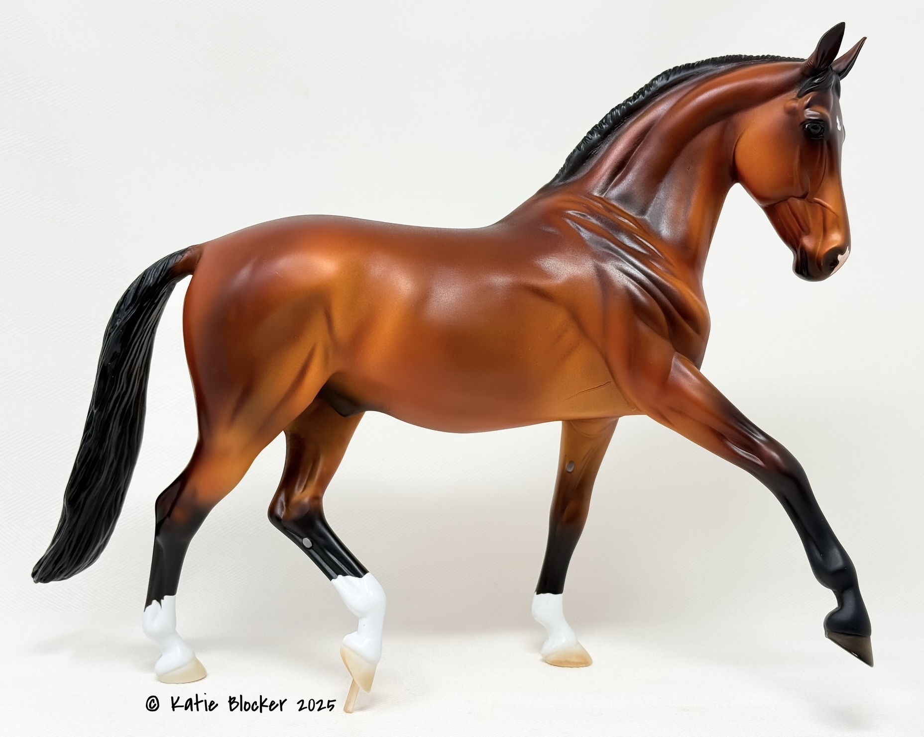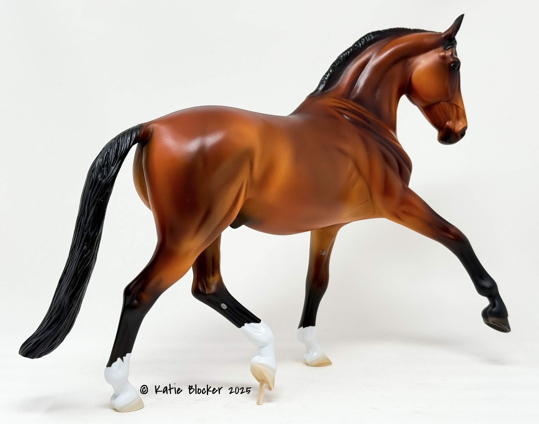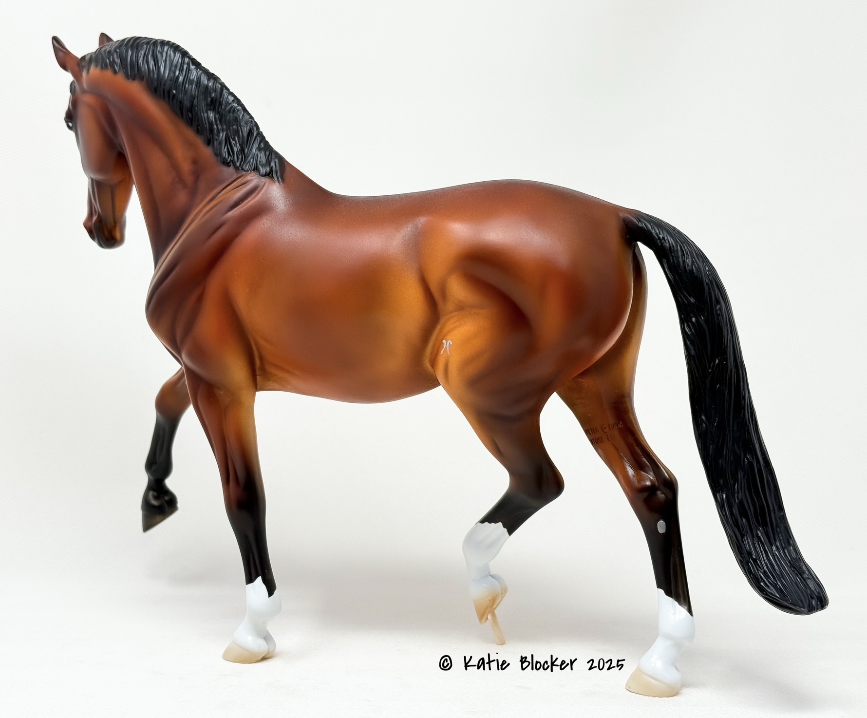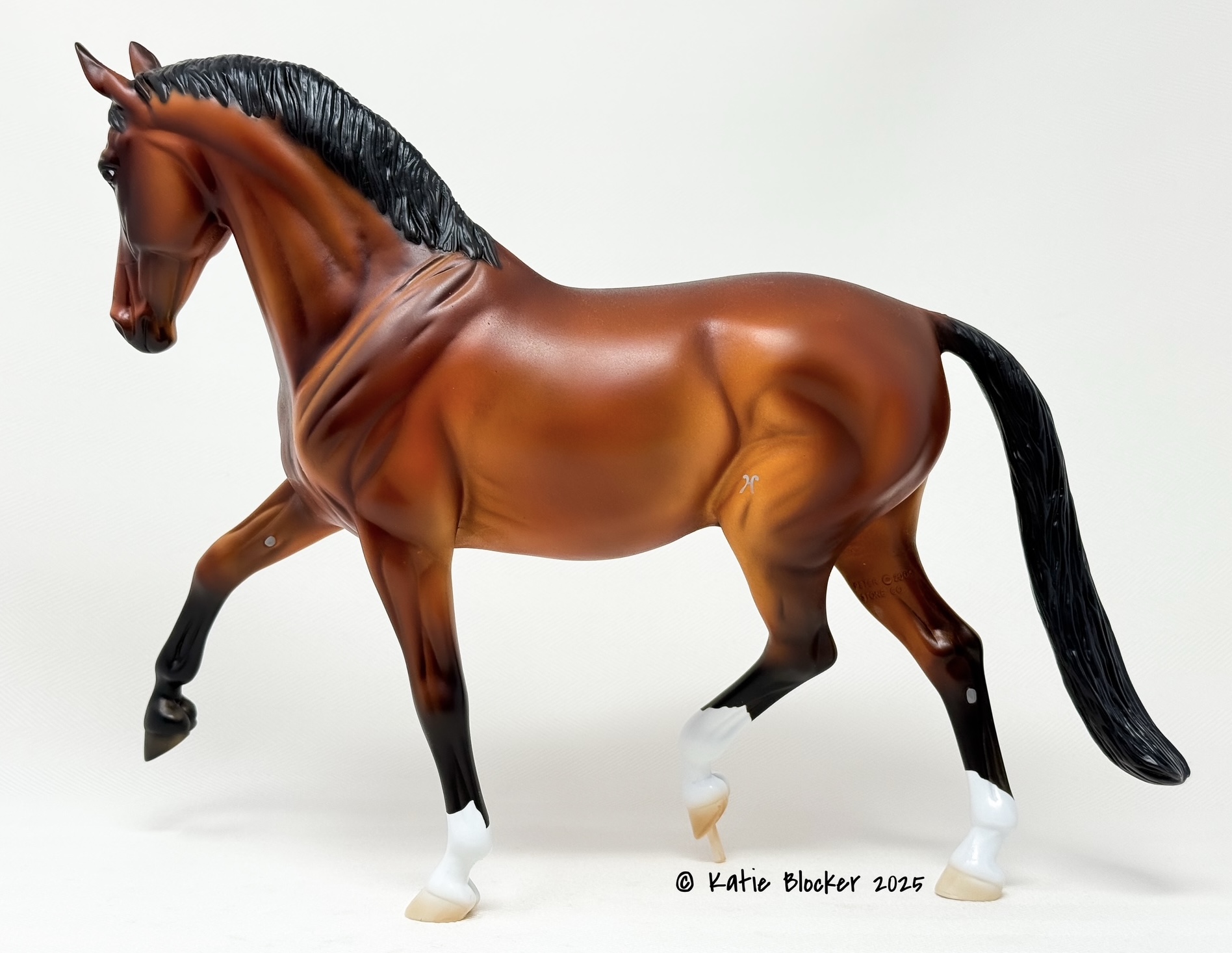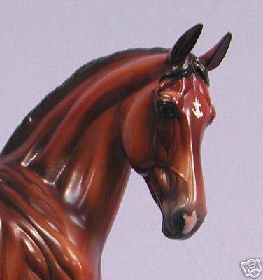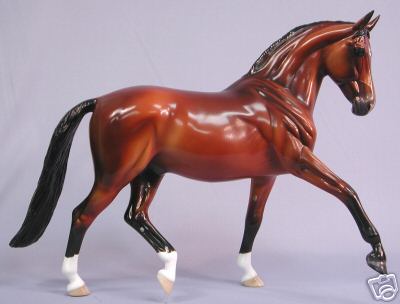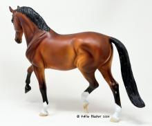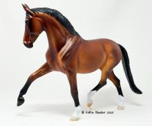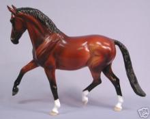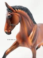 Released at Stone Horses Country Fair 2007, and based on a local schooling horse, Spago is the very first release of the newest mold, a Warmblood doing a Half-Pass Dressage movement. This is a run of 150 pieces.