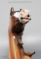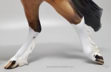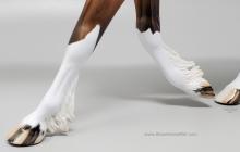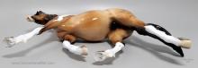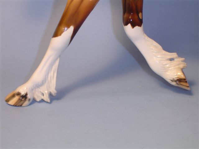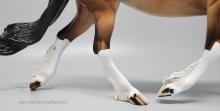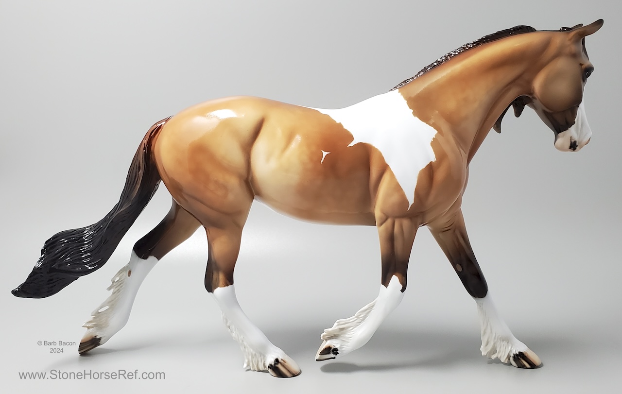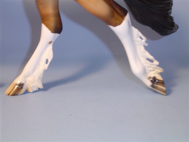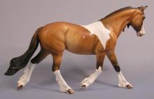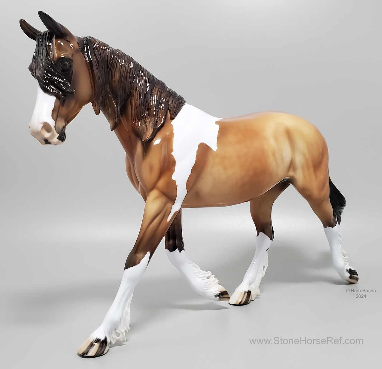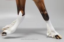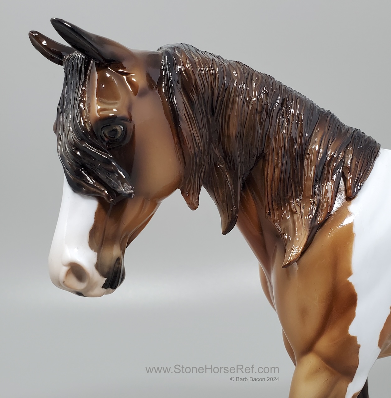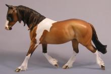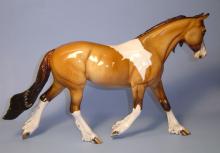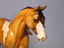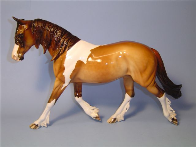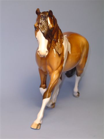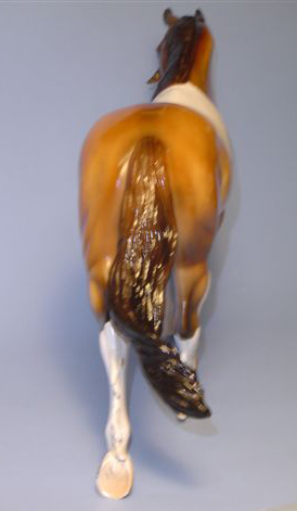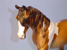 This is a One-of-a-Kind Palouse. Painted in a Dappled Chestnut Pinto pattern, this gal has a tucked head with a remade long mane, and forelock. Her tail has been completely replaced with a long sweeping tail, and her legs have had leg feathers added. This is a truly unique model customized by Jackie Turner. Glossed at the Factory.