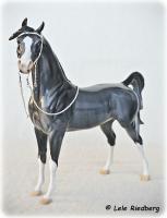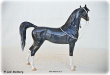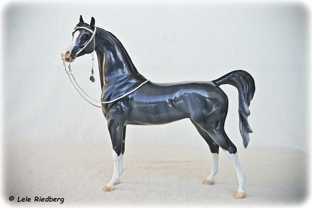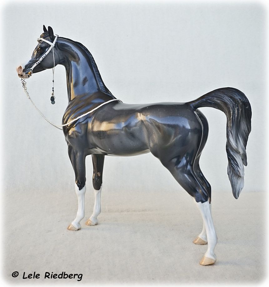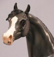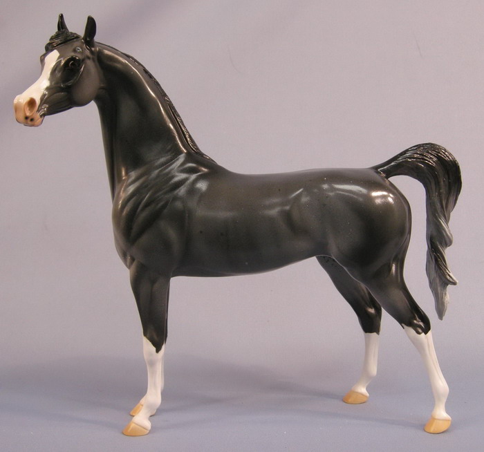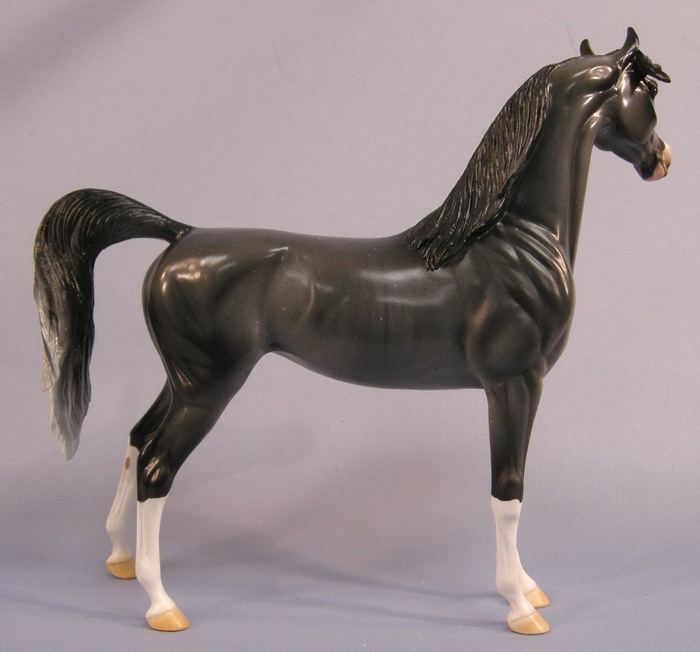 This is a One-of-a-Kind Arabian. Painted Grey with Rabicano markings, four white socks and a blaze with a pink nose. This is a mare, complete with udders. She has a loose tail and comes in a glossy finish.