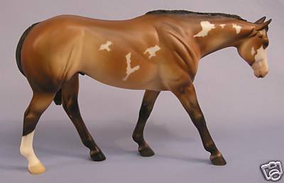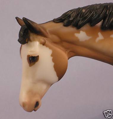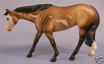 One of a Kind Western Pleasure Horse. Painted in a sooty Buckskin Pinto color, he has a bald face, with one sock. He has a custom mane on the left side of his neck, and a custom sweeping tail, with added hair details. He was available in matte or glossy finish.
