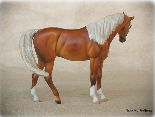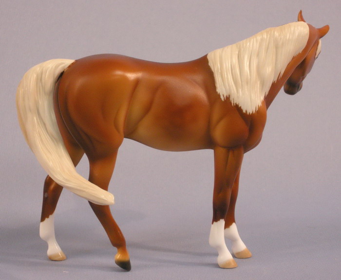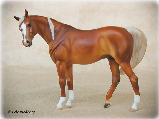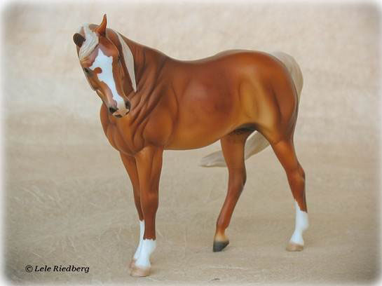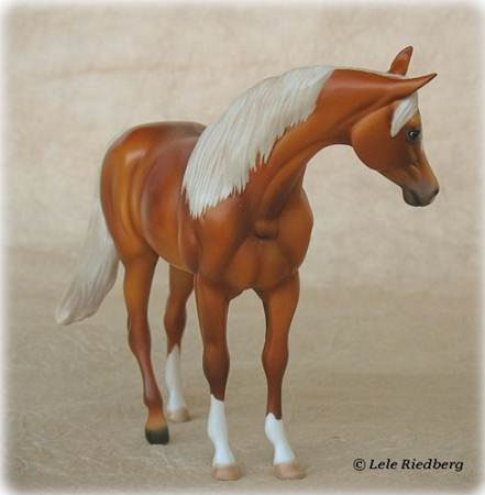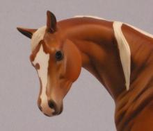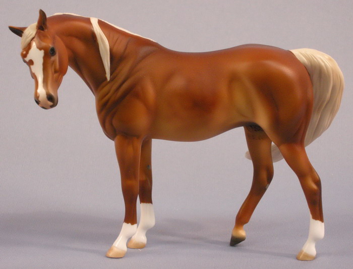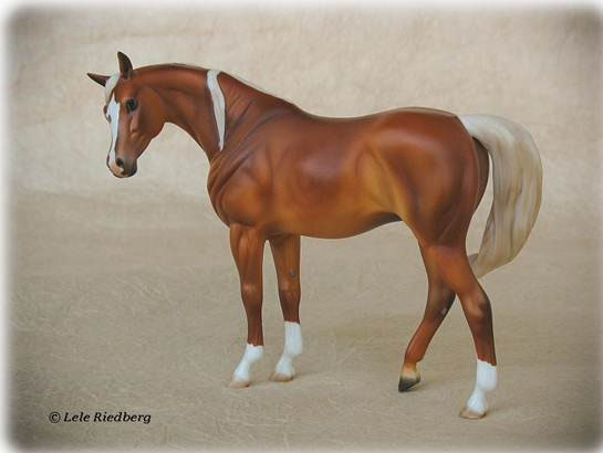 This is a One of a Kind Arabian Pebbles Mare. Painted in a dapple Chestnut, she has a turned head with a flicked ear, repositioned leg, and swishing custom tail. Available in matte or glossy finish.