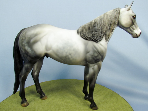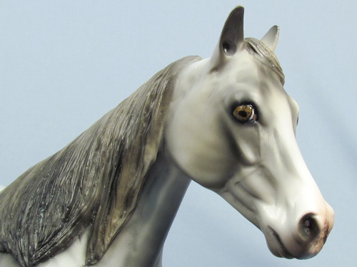 This is a limited run of 10 Ideal Stock Horses. They are painted a very dark Dapple Grey with extensive dappling, exquisite shading, a shaded mane and tail, and a pink nose. They are heavily customized with a straightened head, twitched ear, carved ears, nose, muzzle and lip wrinkles, a refined jaw line and facial detailing, a long sculpted mane with lots of fine detail, and a matching long banged tail with more added details. Available in matte or glossy finish.
