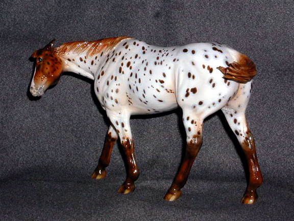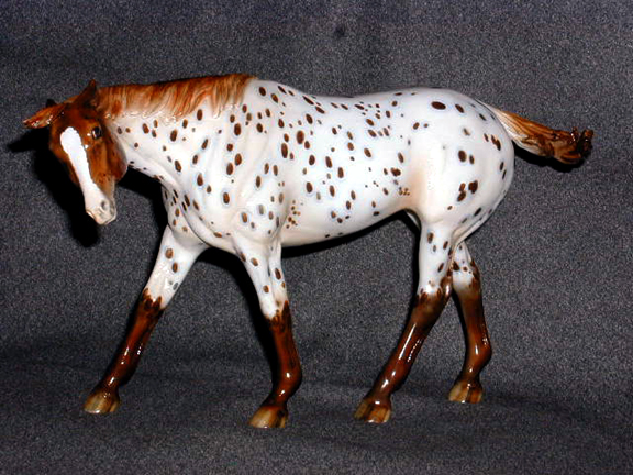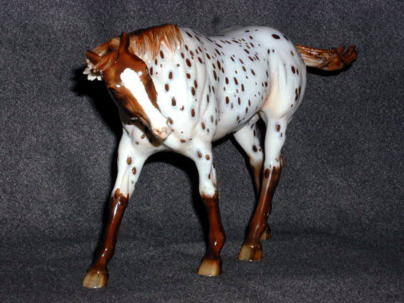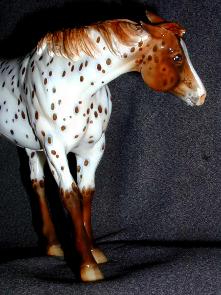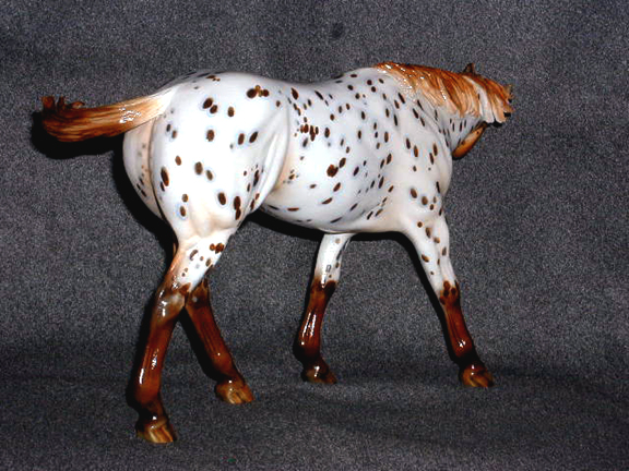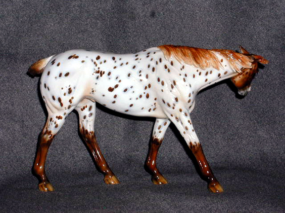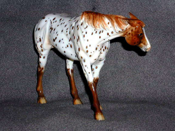 AHQUABI is not designed after a real horse, but just represents something I really like. The WPH model is one of my favorites, an oldie but a goodie, and I simply LOVE leopard appaloosas. The Stone Company has made a few chestnut leopard appys; I've never seen one done on this model. So since I had already decided I wanted a chestnut appy, I thought the WPH would be the perfect choice. In communicating with the company I didn't want to put too many "restrictions" on their artistry, but rather wanted to let those wonderful artists "have at it." All I requested was the WPH horse in a chestnut appy on the order of OOAK "Swag Bag," but one who is annoyed at something just behind him; one whose head is turned and cocked and has his ears pinned. Aiming for more of an original, foundation-type appaloosa, I asked for a ratty tail and an appy-looking ratty-ish mane. Designed by Laurre Breman.