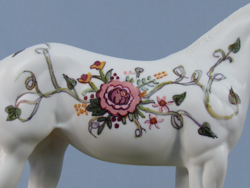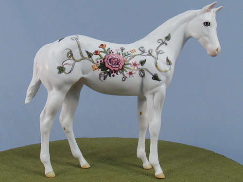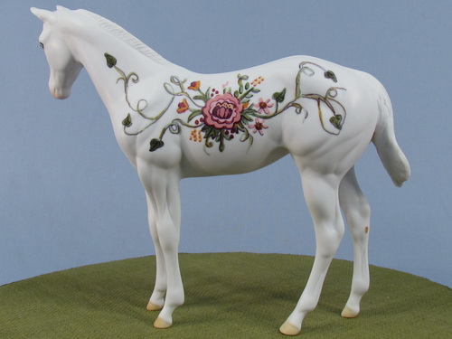 This is a One of a Kind Weanling. Painted in a decorator floral pattern, these are hand painted details. Done in a matte finish.