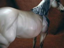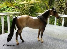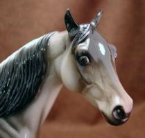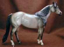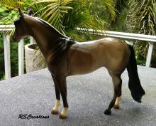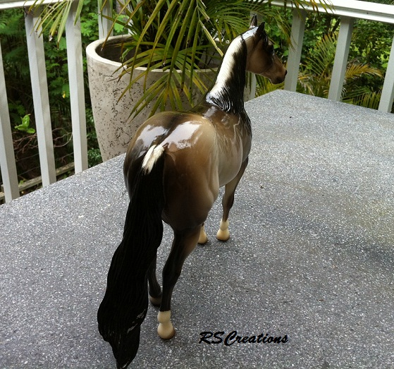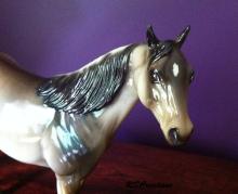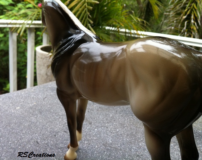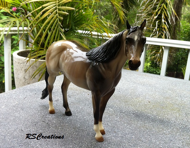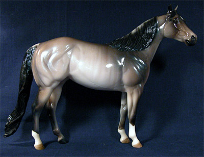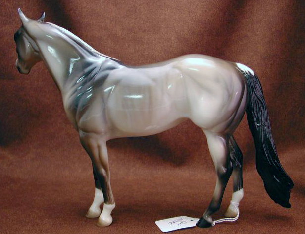 Judge's model for the Quarter Horse Congress 2003 show. Just like the show special run, Buckeye Queen, but is glossed and has three socks. Painted in a dun rabicano color with three socks. She has the extra front right sock. She also has a factory custom twitched ear. Only eight were made.