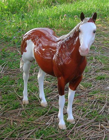 This is a run of Stock Horses. Painted a sorrel splash overo pinto, they have nice shading, a flaxen mane and tail, and blue eyes. They are part of the 2012 Stone Horse Collection and were available in matte or glossy finish.