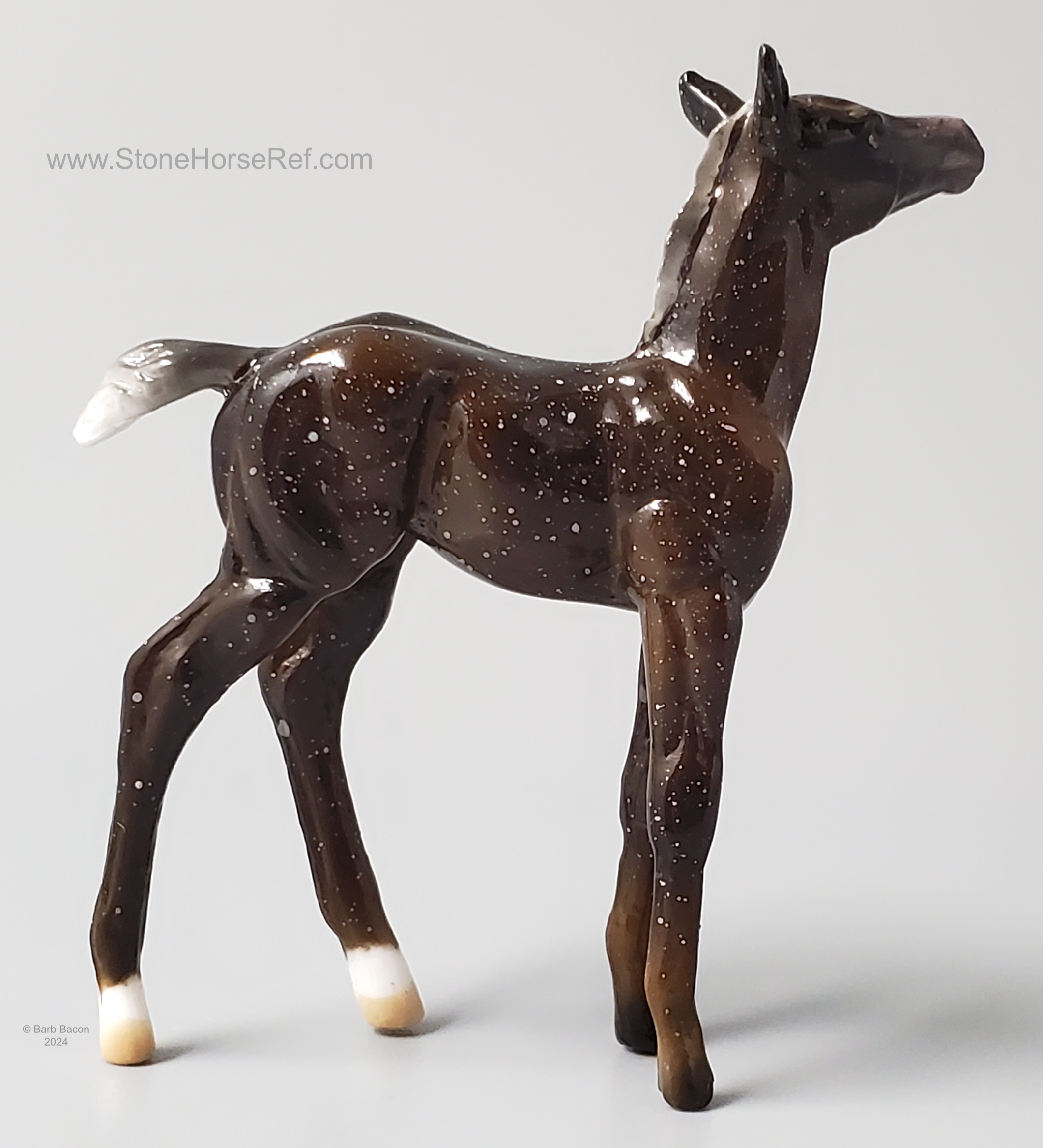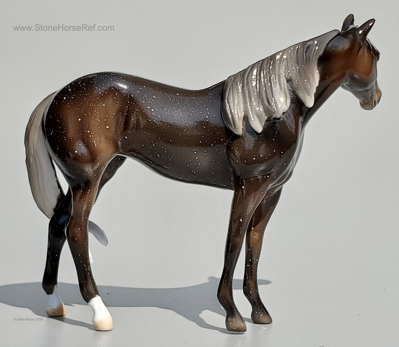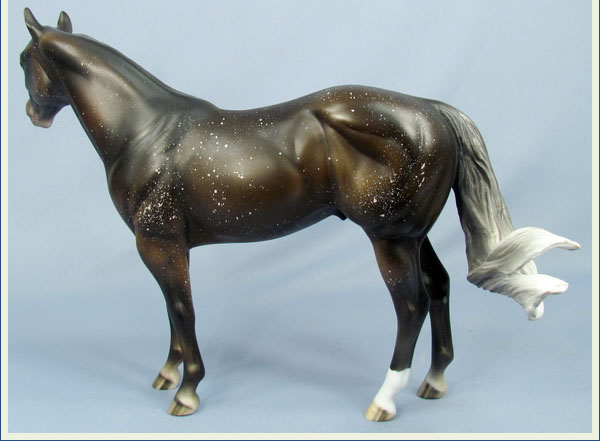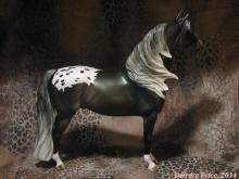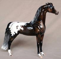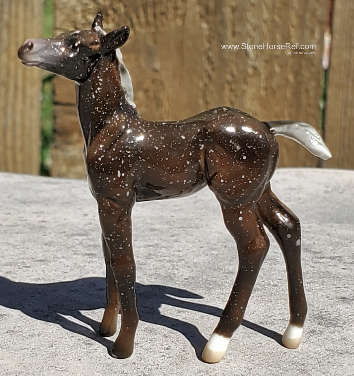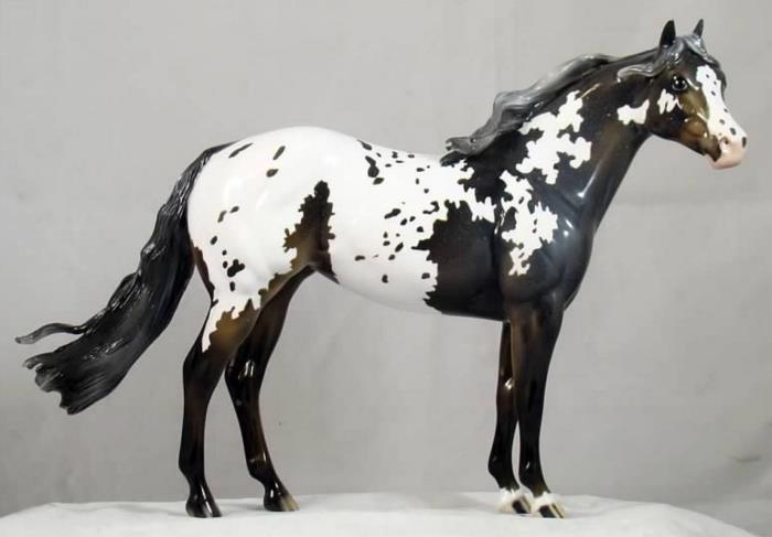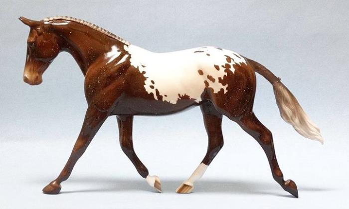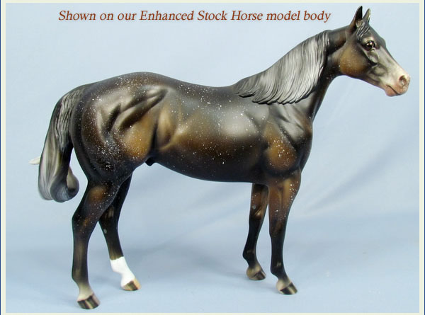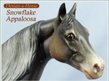 This Snowflake Appaloosa Pattern has been a special color available in the Design A Horse program. It first appeared in 2012, and then again in 2013 during the weekend of Nov 29. The pattern has shading, lots of spots, striped hooves, a shaded mane and tail, and a light skinned mottled nose. Please note the 2012 version only comes with one sock. The sample was done on the 2012 enhanced stock horse body. The actual amount, size, and location of the spots will vary for each model. Not available on Pebbles or Chips until 2013. Comes with hoof stripes unless you choose a leg marking.