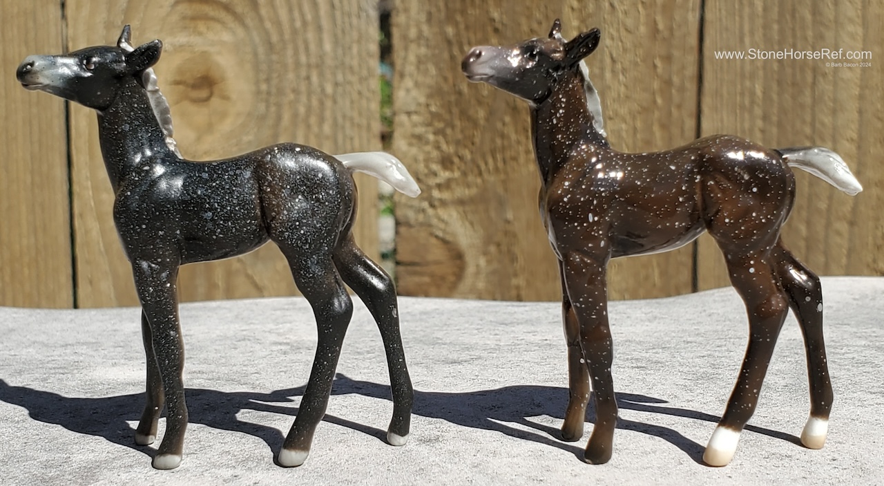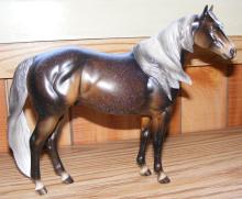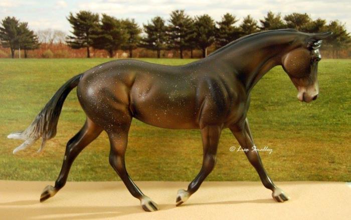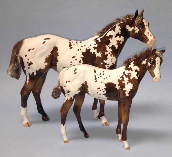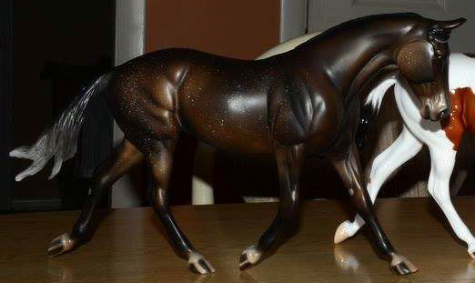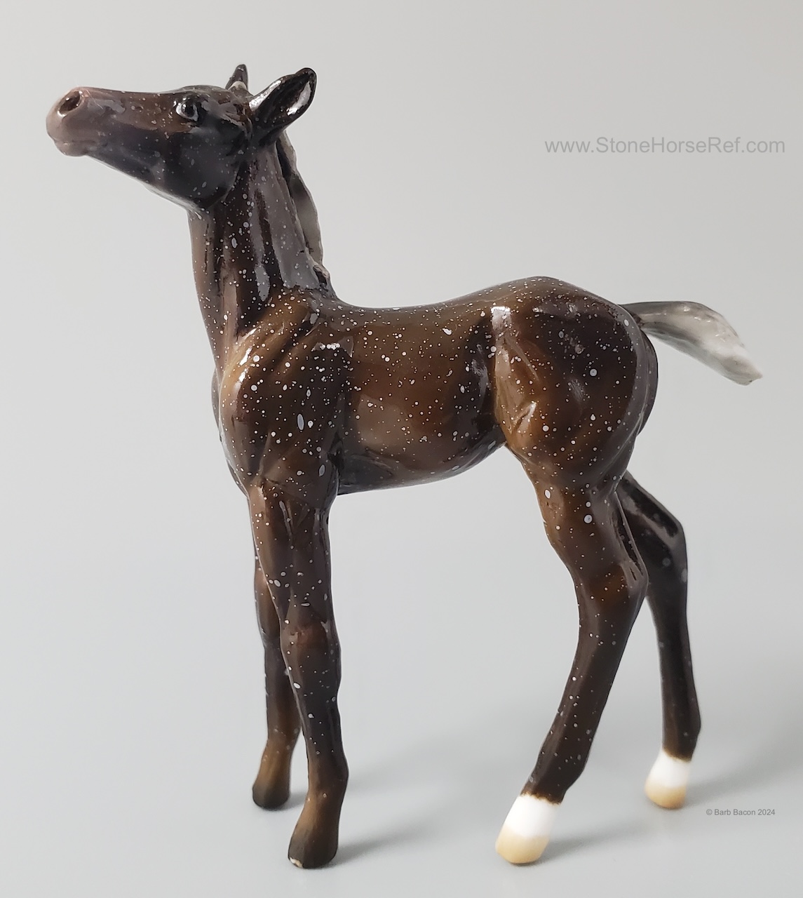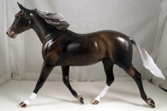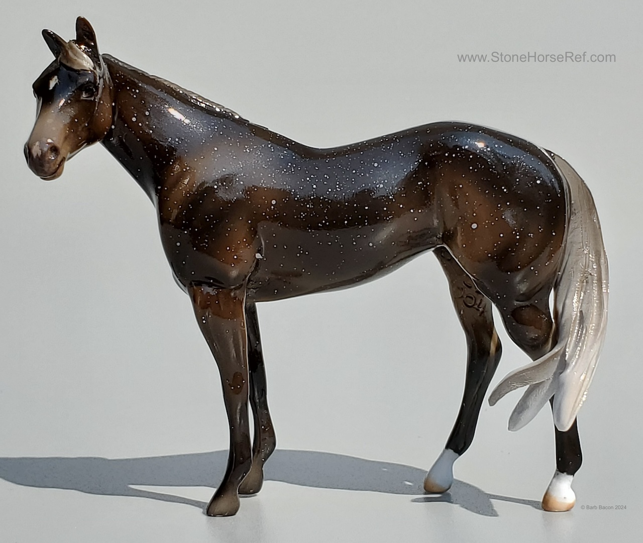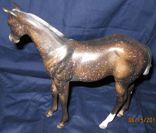 This Snowflake Appaloosa Pattern has been a special color available in the Design A Horse program. It first appeared in 2012, and then again in 2013 during the weekend of Nov 29. The pattern has shading, lots of spots, striped hooves, a shaded mane and tail, and a light skinned mottled nose. Please note the 2012 version only comes with one sock. The sample was done on the 2012 enhanced stock horse body. The actual amount, size, and location of the spots will vary for each model. Not available on Pebbles or Chips until 2013. Comes with hoof stripes unless you choose a leg marking.