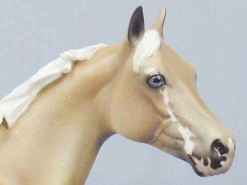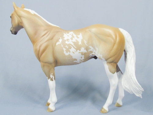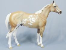This is a One of a Kind Stock Horse. Painted a palomino pinto with a fancy pattern, four socks, an unusual face marking, a pink nose and blue eyes. He is customized with carved ears and nose detail, a sculpted mane with lots of fine hair detail, and a swishing long tail with added hair details Available in matte or glossy finish.