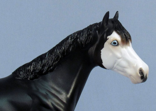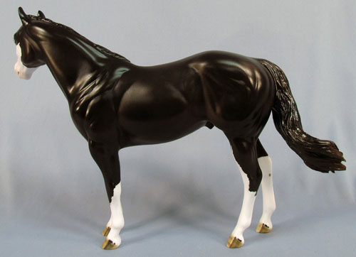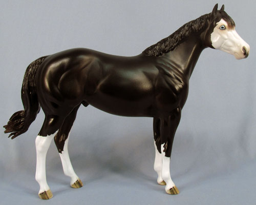 This is a One of a Kind Stock Horse. Painted dark brown with four socks, striped hooves with ermine spots, and a bald face with pink skin, kissy spots and blue eyes. He is customized with carved ears and nose detail, a sculpted long forelock with refined hair detail, a remade short collected mane with added detail, and a short swishing tail with added hair detail. Available in matte or glossy finish.