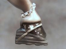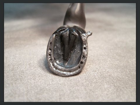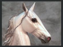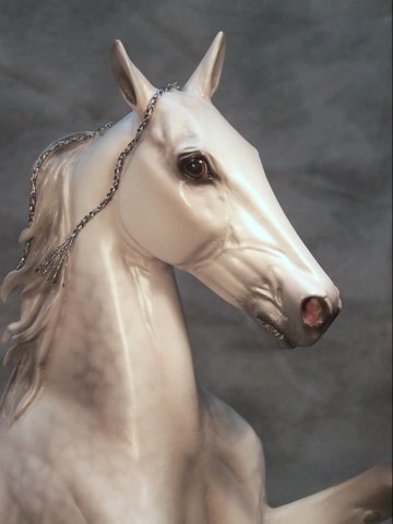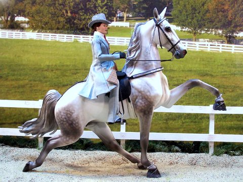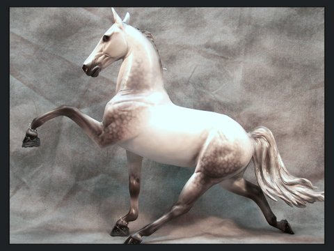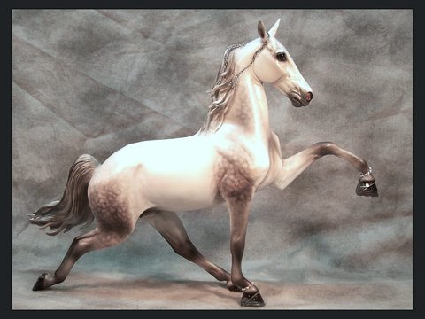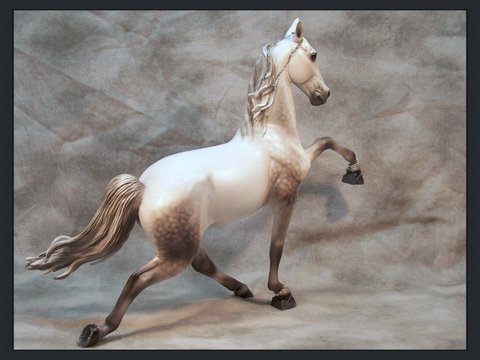 This is an Extreme Factory Custom Thoroughbred that was a 2011 You Call It transformed into a Padded Performance Tennessee Walker Mare. Just about every section of this model has been resculpted. The only recognizable part of the Thoroughbred left is the barrel area. The head was legnthened and face filled in to resemble a TWH more. Show braids were placed by the owner. Resculpted nose and mouth. Carved, twitched ear. Resculpted, detailed mane and "set" tail. Every leg has been repositioned. Stacked shoes along with shoe bands were sculpted to the front hooves. (Action chain around pastern was attatched by owner). Horse shoes with "trailers" were sculpted to the carved, detailed hind hooves. She is painted a dapple gray and was created in the likeness of the real show mare. She is in a Satin finish. Custom work by Jackie Turner. Painted by Carrie Keller. Designed by Joyce Savage.