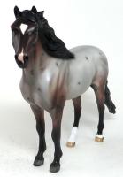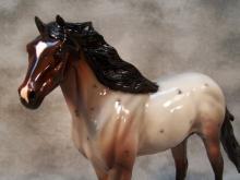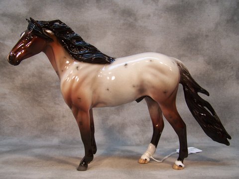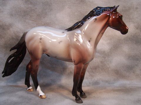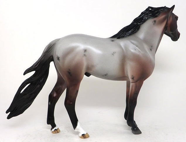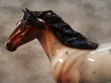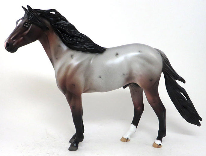 EL SAVACHE - This is an OOAK Factory Customized Mustang that was offered at the December Warehouse Sale. He has a slightly turned head to the left with an enhanced mane. Factory customized by Jackie Turner and painted a bay roan with a star, snip, a right rear hind sock and a left coronet band with striped hooves painted by Carrie Keller. He is finished in a high gloss.