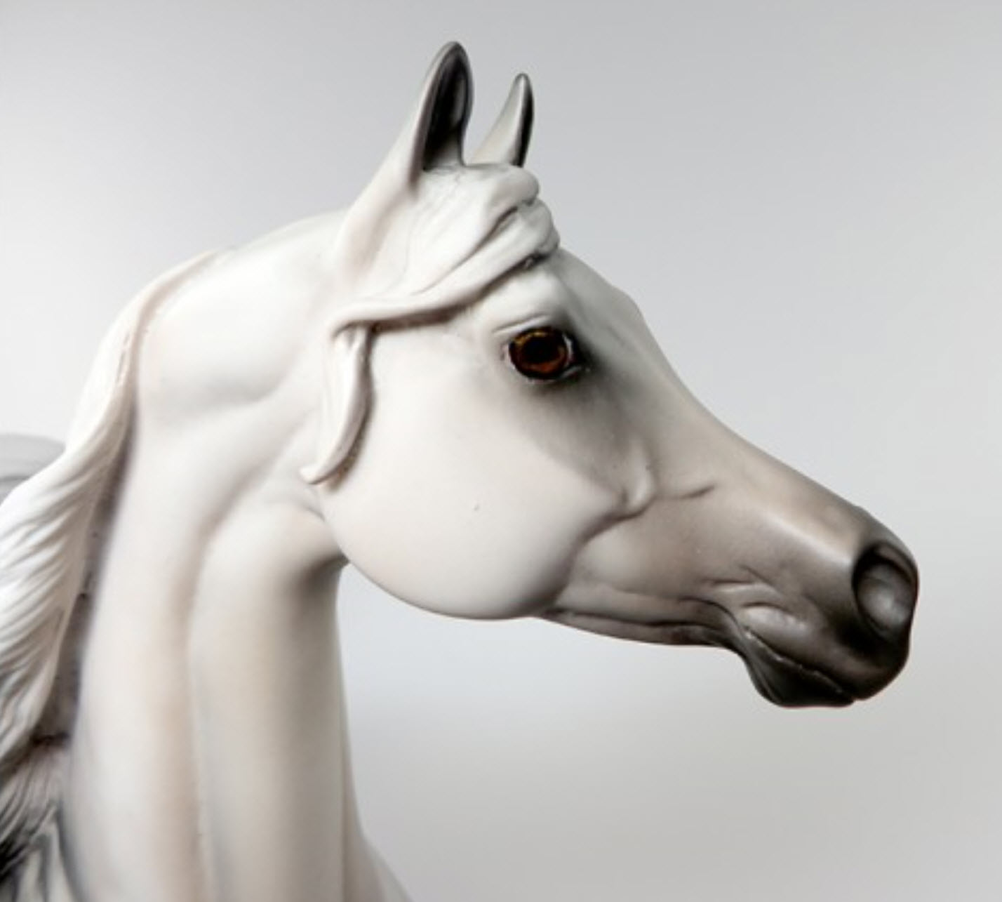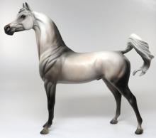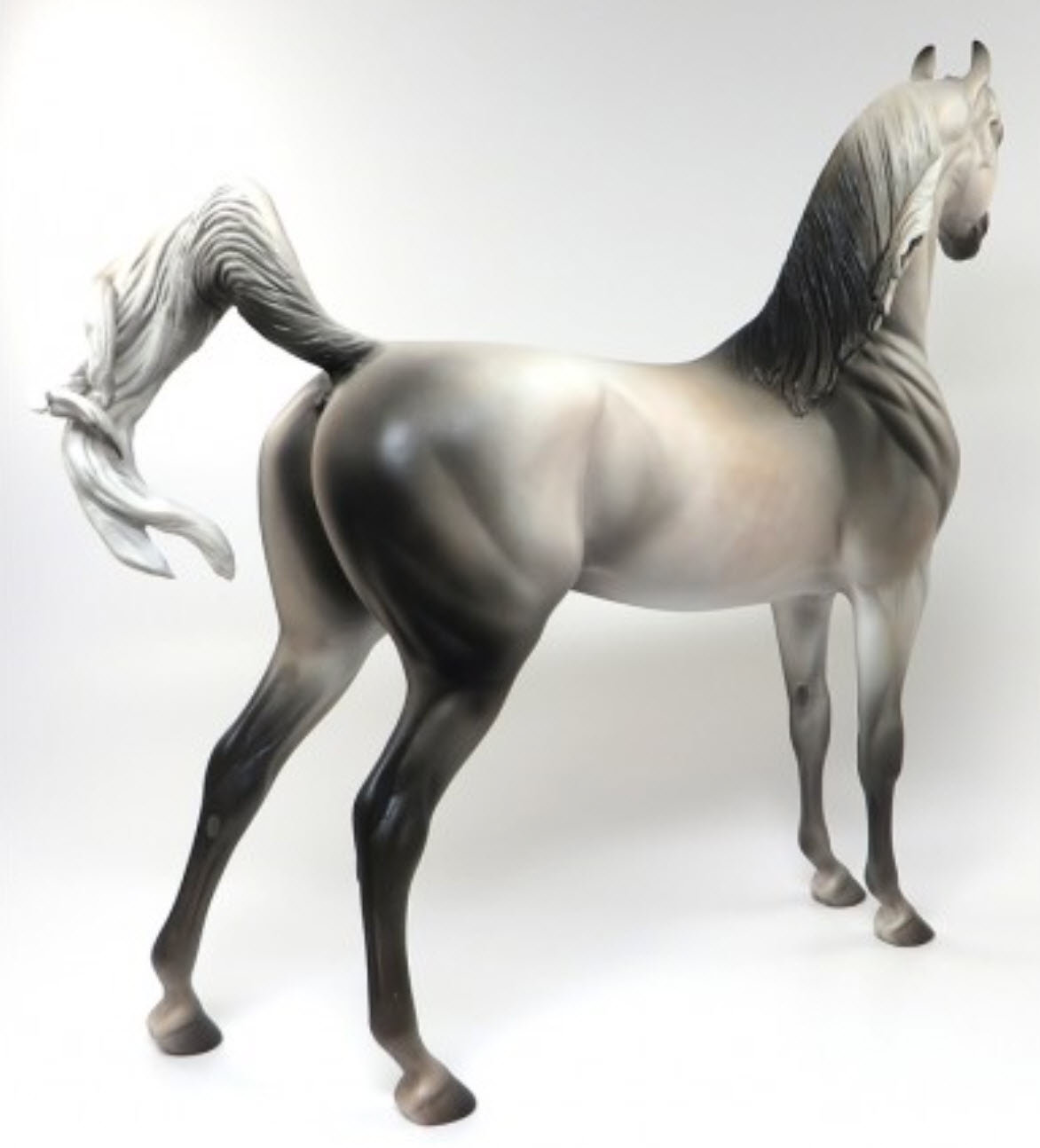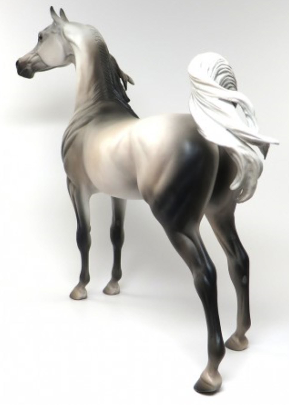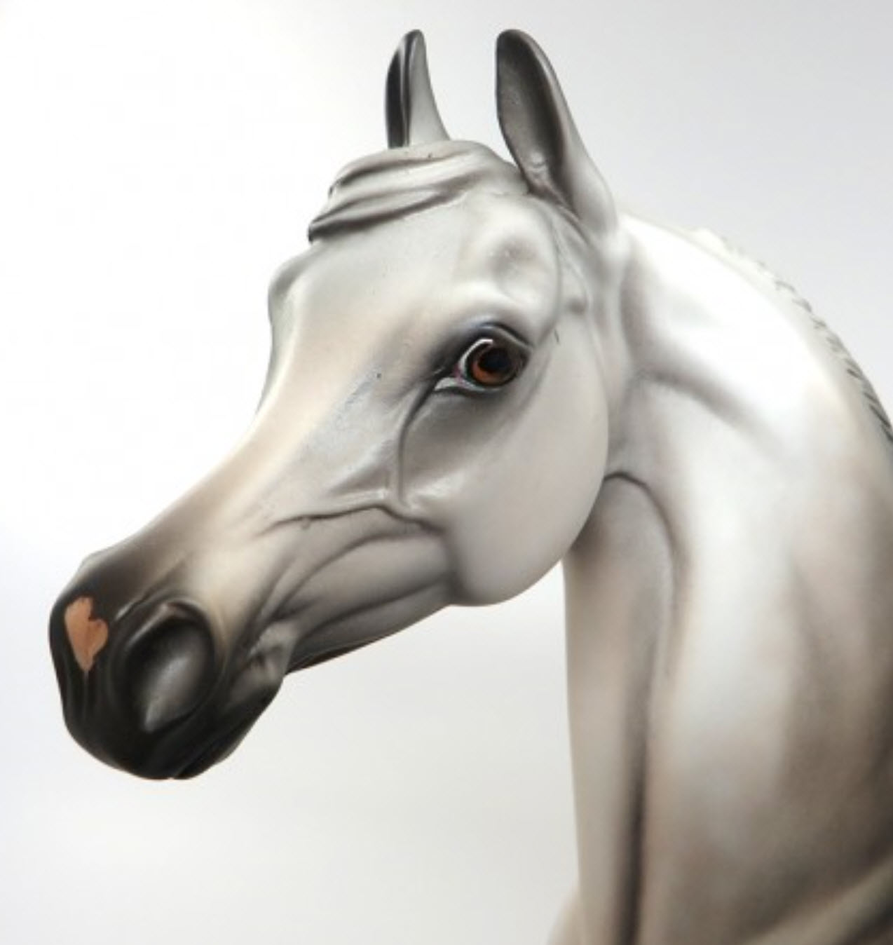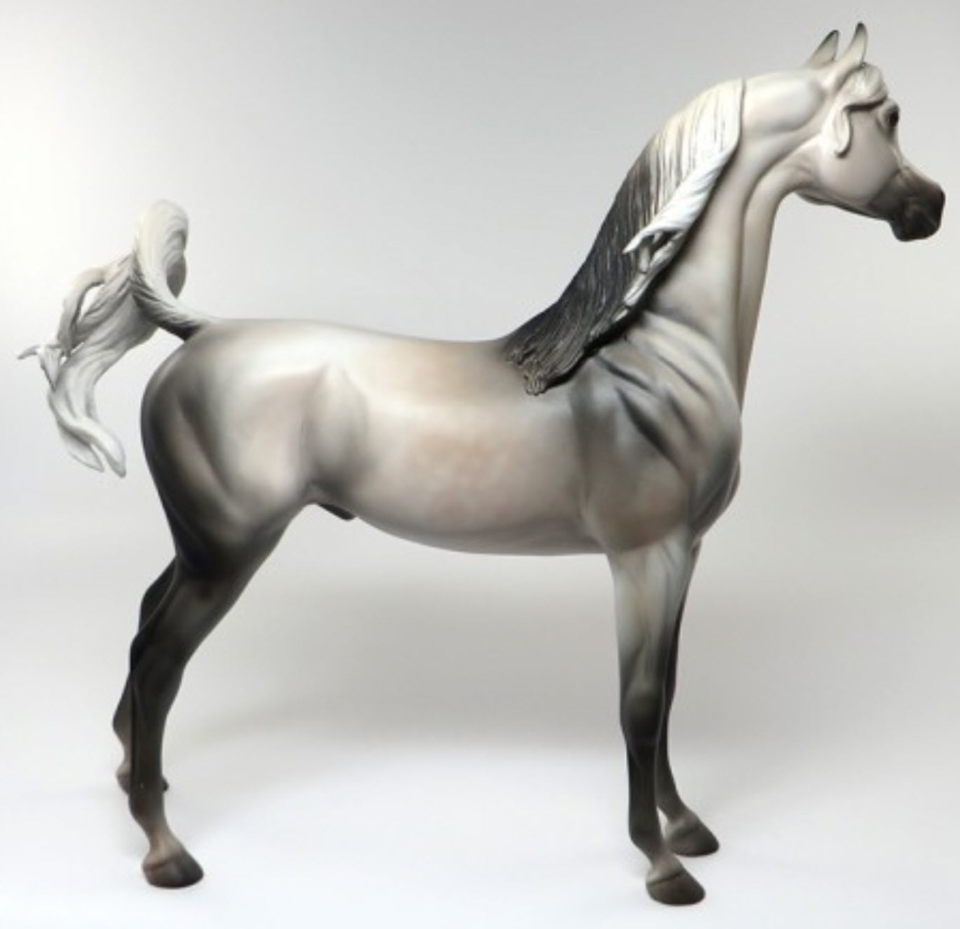 SHEEZ - OOAK Light Grey Arabian, Custom Mane and Forelock, Carved Ears, Nose and Jaw, Custom Tail, Pink Heart, Painted and Signed by Karen Dietrich of KL Keepsakes, 6/13. Hand Crafted & Painted in Shipshewana, IN.