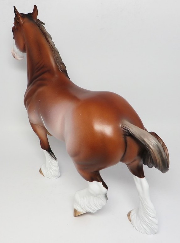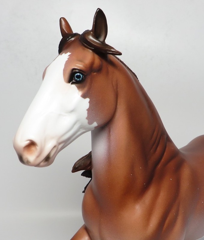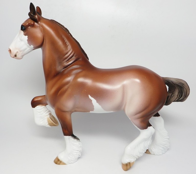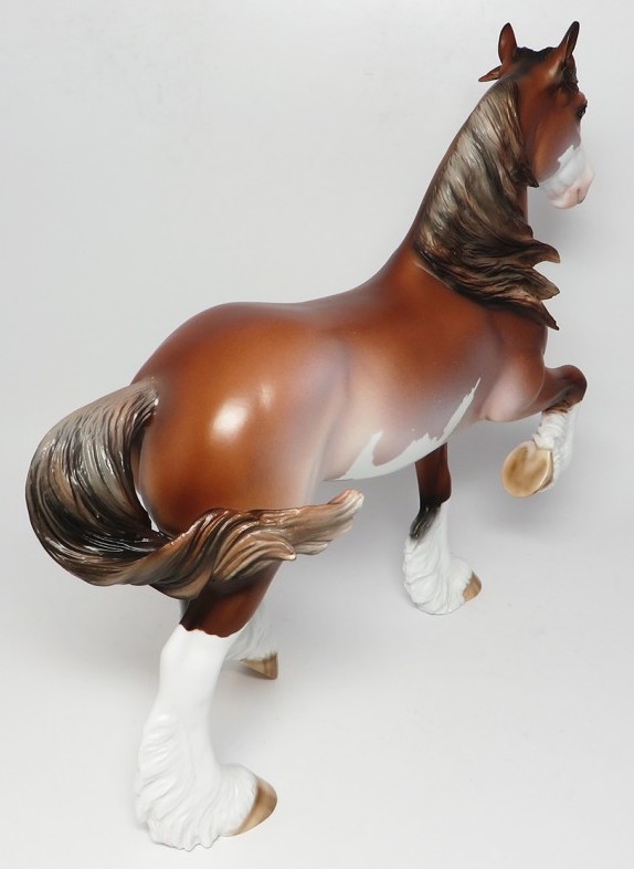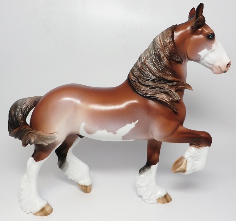 BARLEY - OOAK Trotting Drafter, Blue Eyes, Chestnut Pinto, Custom Mane, Custom Split Forelock, Custom Tail, 4 White Socks, Striped Hooves, Painted and Signed by Carried Keller, 4/13/17. Hand Crafted & Painted in Shipshewana, IN.