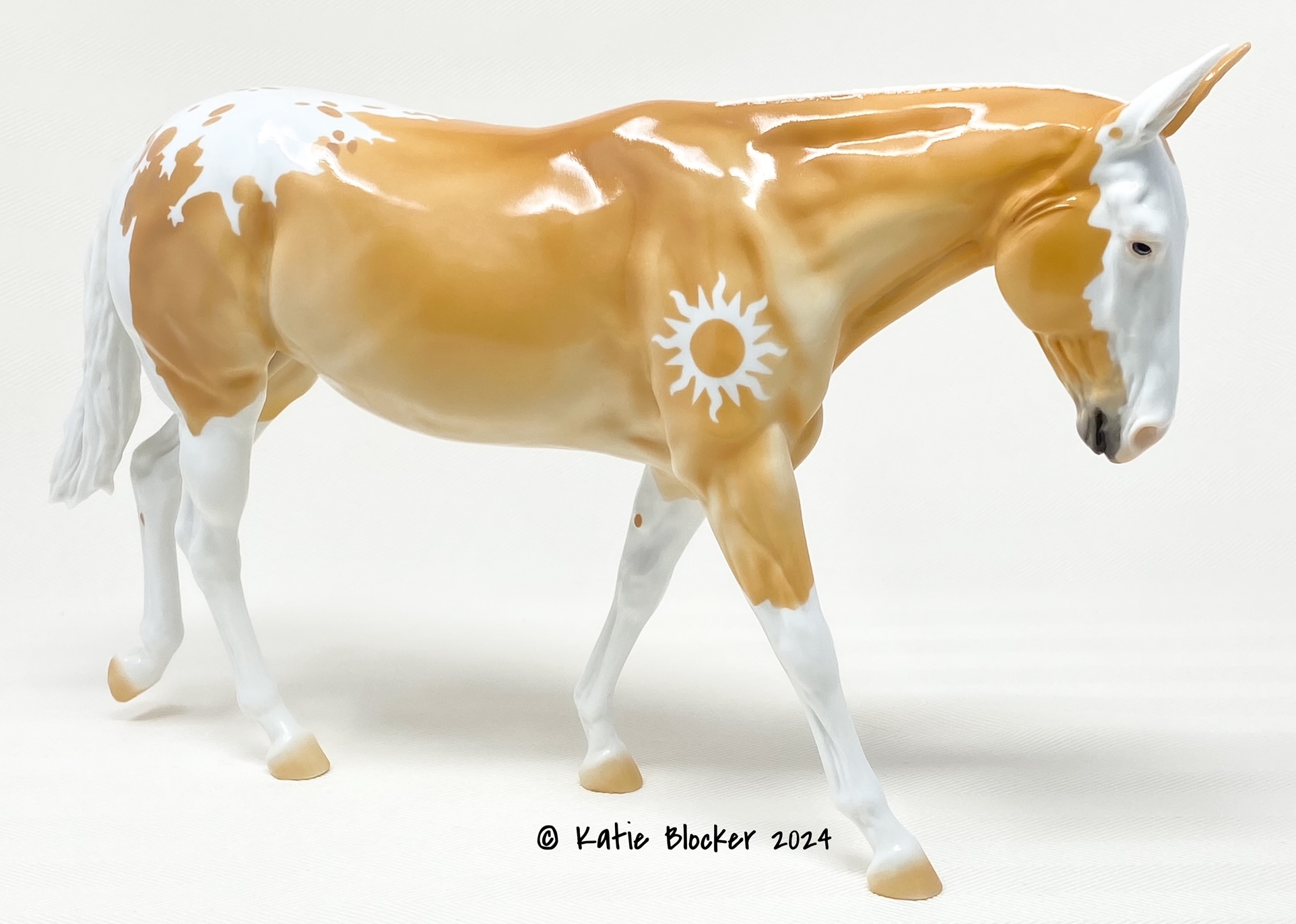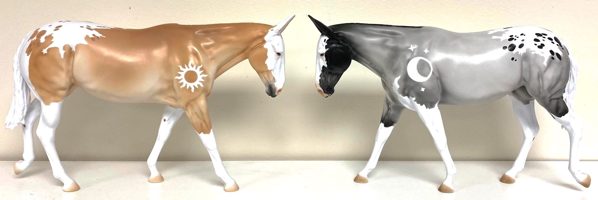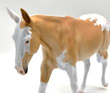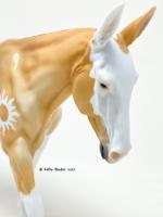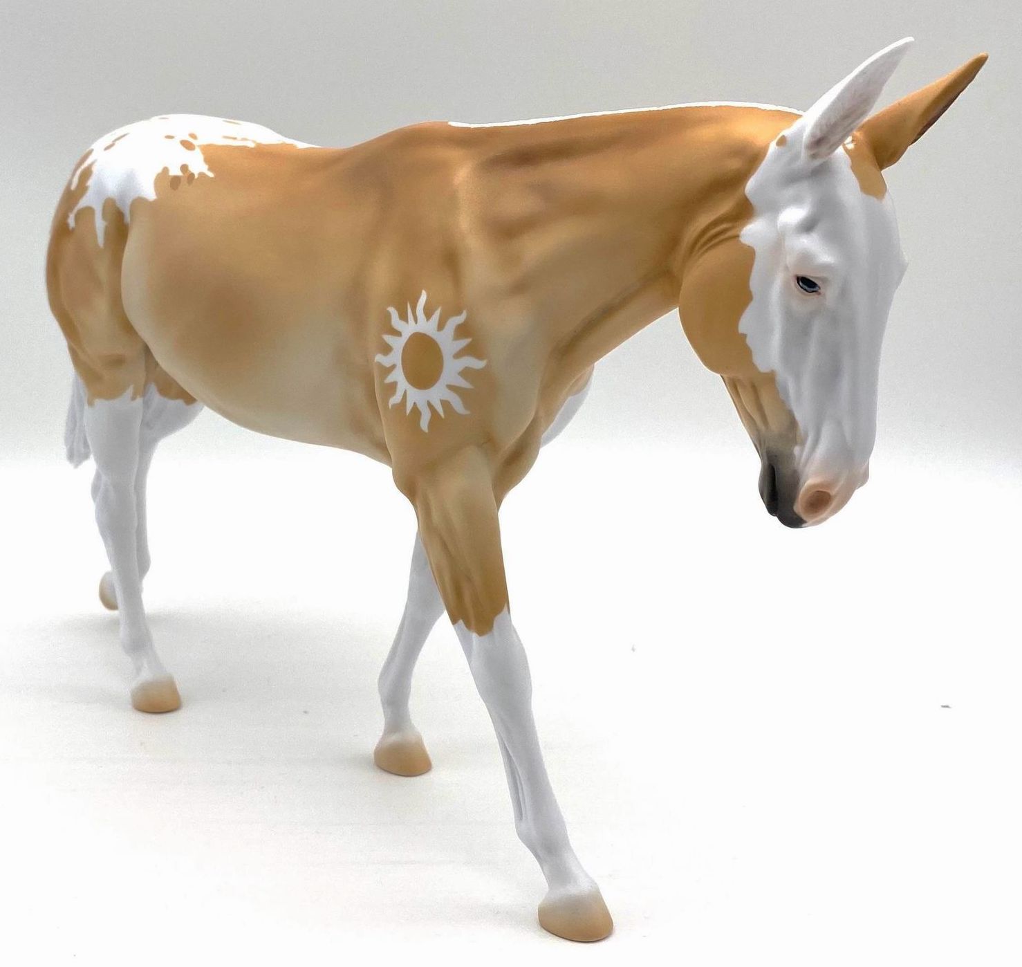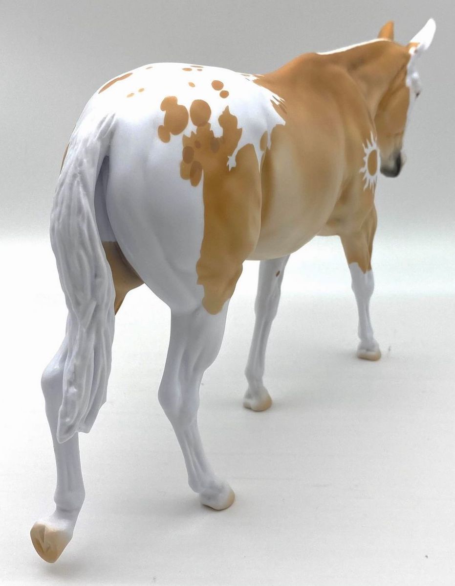 ECLIPSE - Limited Edition of 38, Loyalty Member Release, Black Friday 2021. First Release on the Mule mold. Gambler's Choice - either the Palomino or the Roan would be shipped randomly. Paint job designed by Lindsey Fiscus, and was initially intended to be a palomino on one side and roan on the other, representing both the sun and moon. "This gal is a little funky! She is half blue roan and half palomino, both sides with a fun splash pintaloosa pattern! She has a sun and a moon on either shoulder, to represent what both sides of her mean. I really wanted to represent how two opposites can come together to make something beautiful, whether it be the sun and the moon, or a horse and a donkey! Thank you so much for this amazing chance, I had so much fun!"