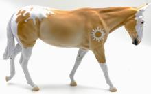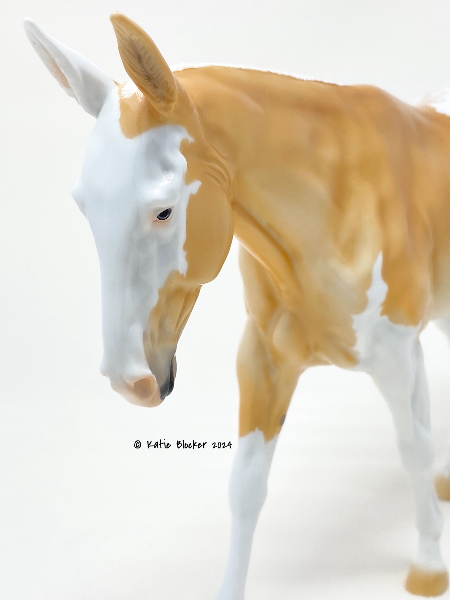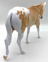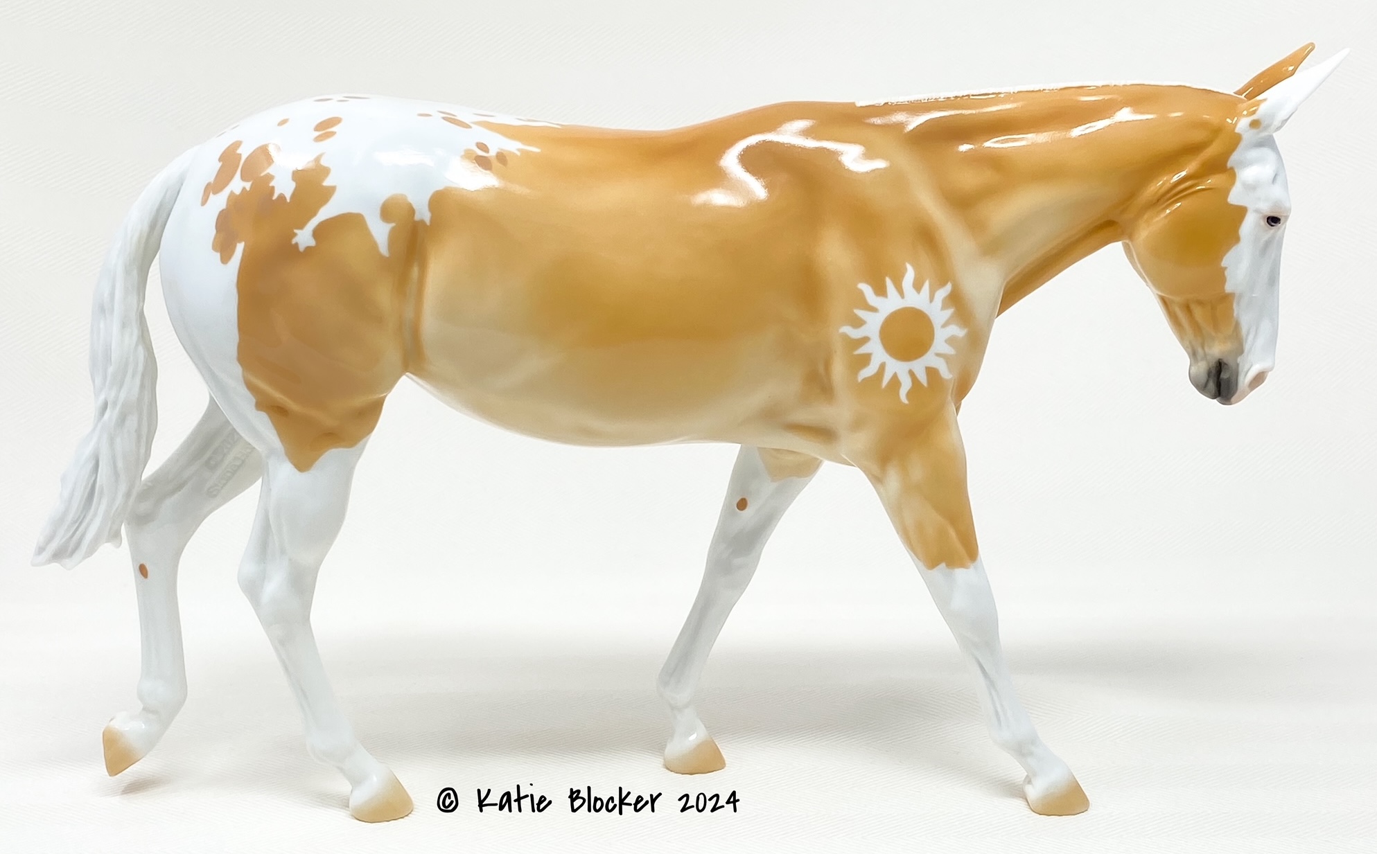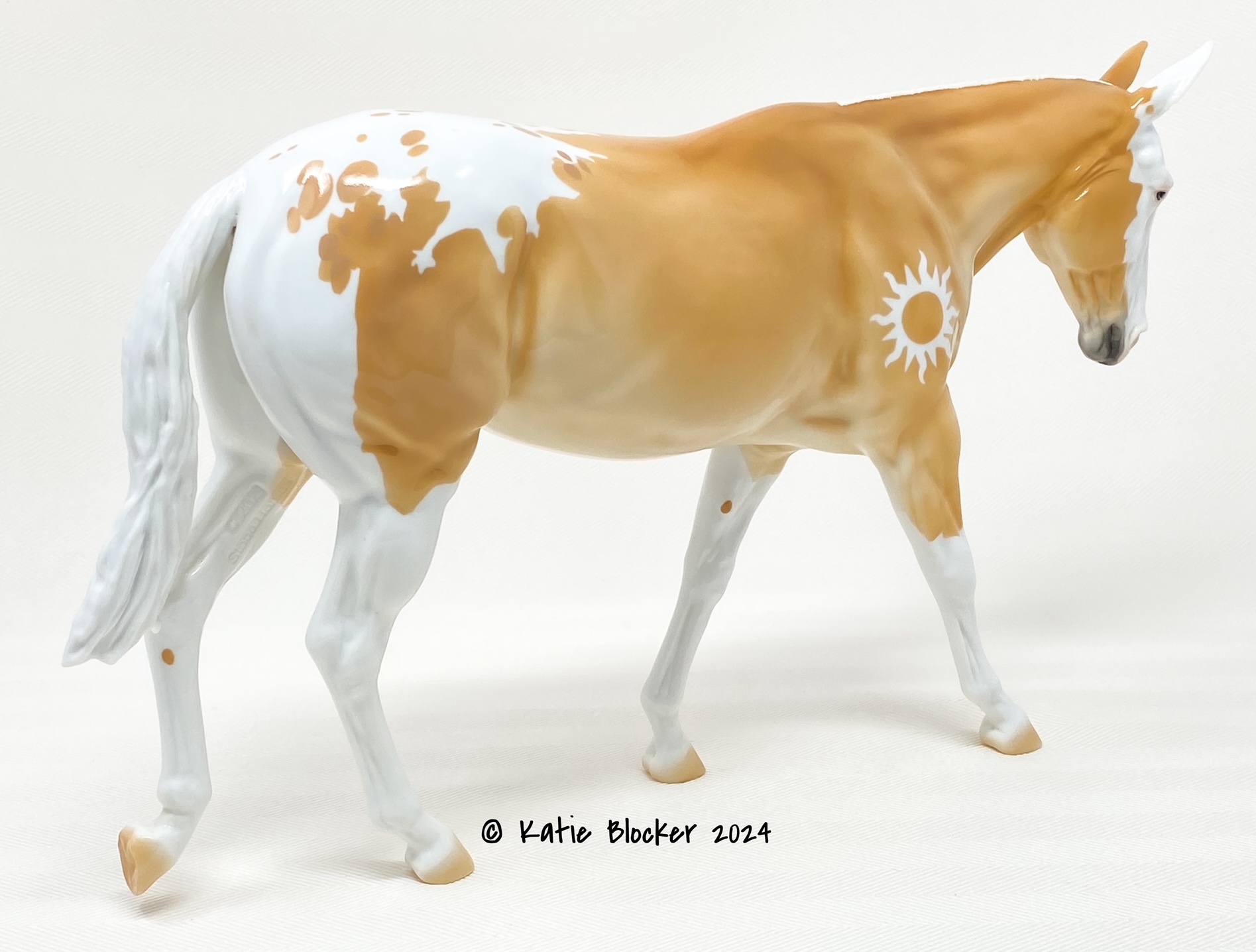 ECLIPSE - Limited Edition of 38, Loyalty Member Release, Black Friday 2021. First Release on the Mule mold. Gambler's Choice - either the Palomino or the Roan would be shipped randomly. Paint job designed by Lindsey Fiscus, and was initially intended to be a palomino on one side and roan on the other, representing both the sun and moon. "This gal is a little funky! She is half blue roan and half palomino, both sides with a fun splash pintaloosa pattern! She has a sun and a moon on either shoulder, to represent what both sides of her mean. I really wanted to represent how two opposites can come together to make something beautiful, whether it be the sun and the moon, or a horse and a donkey! Thank you so much for this amazing chance, I had so much fun!"