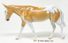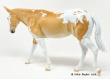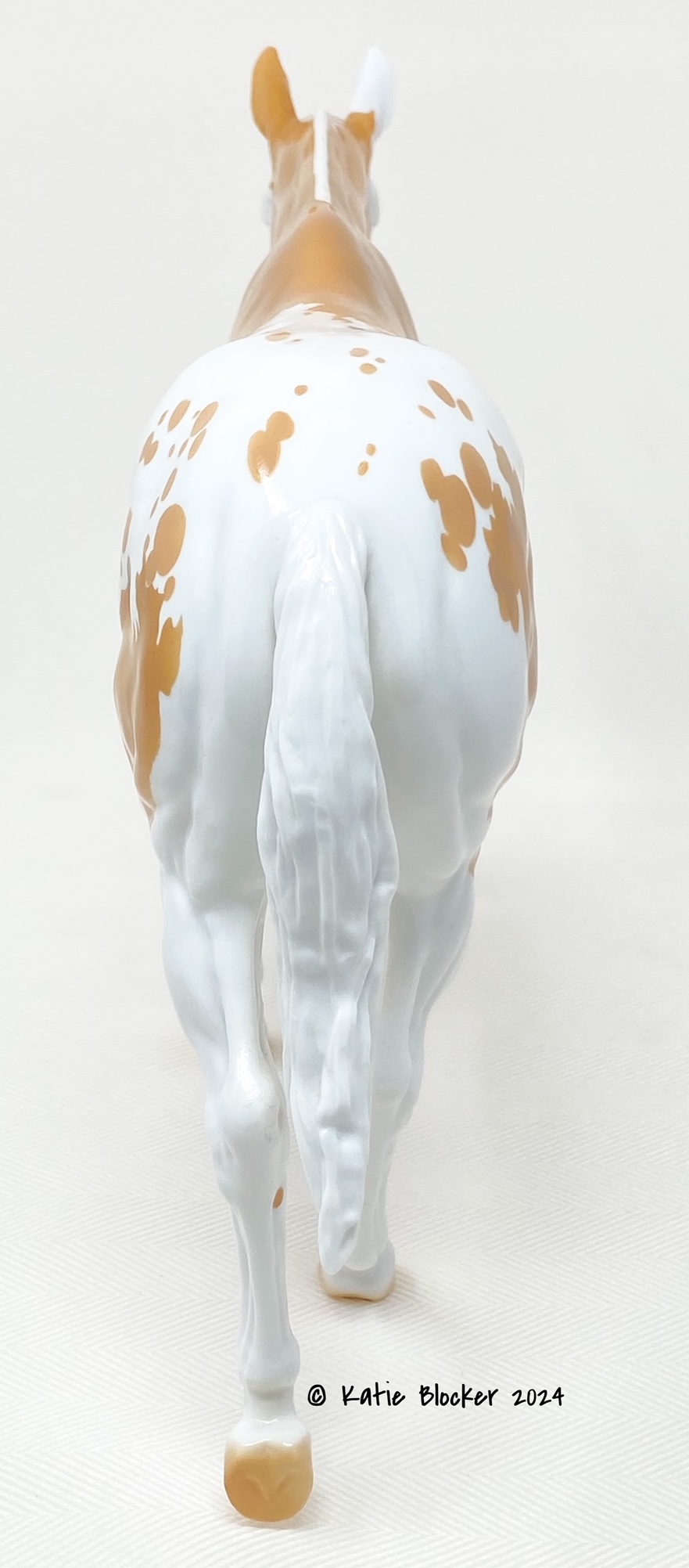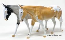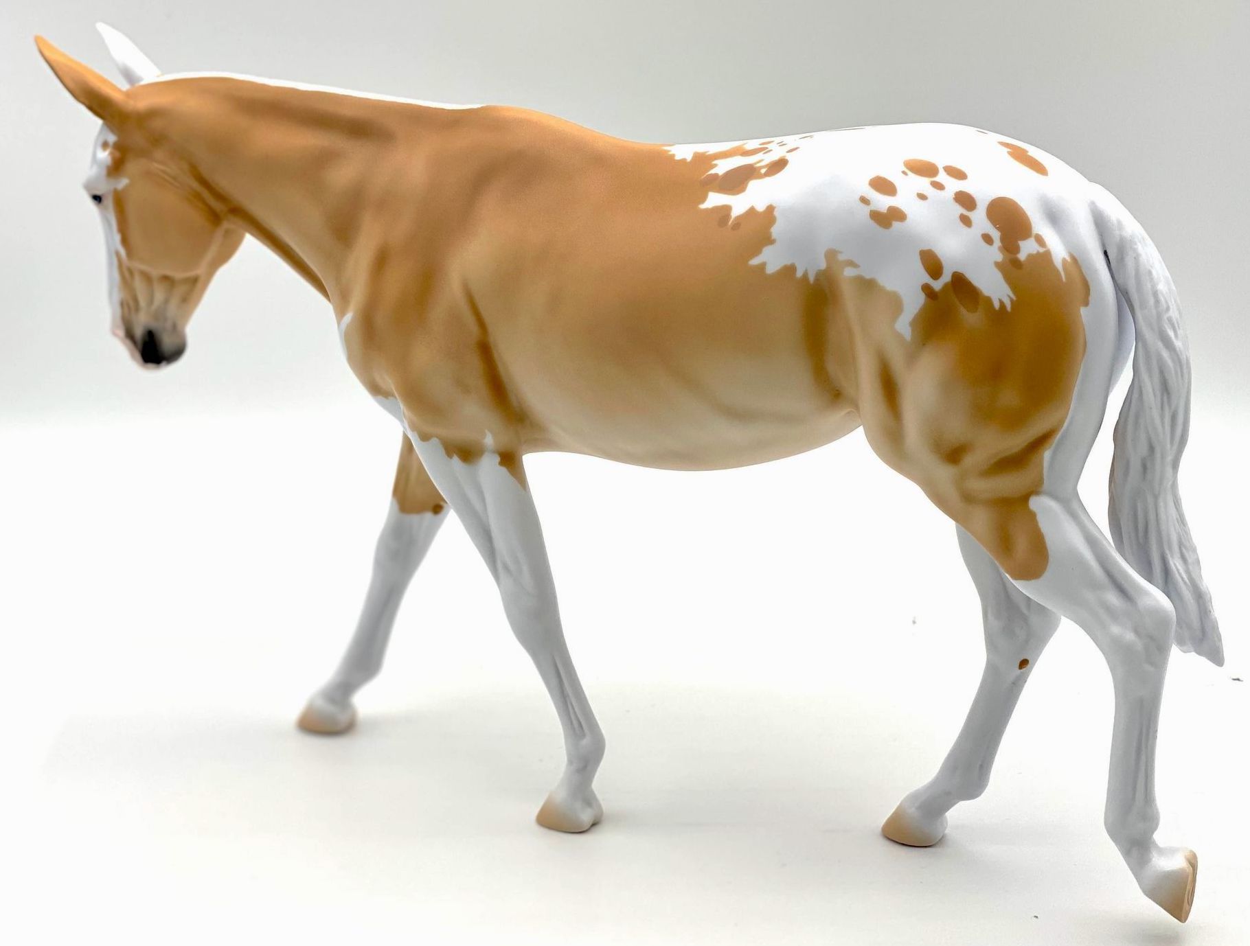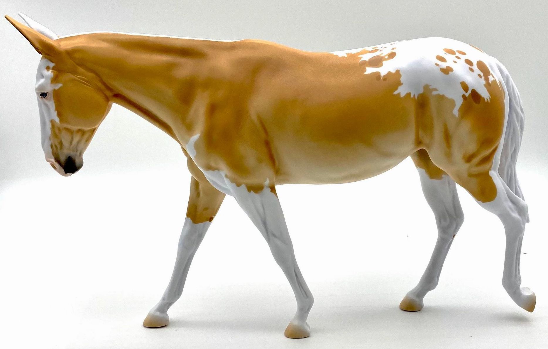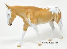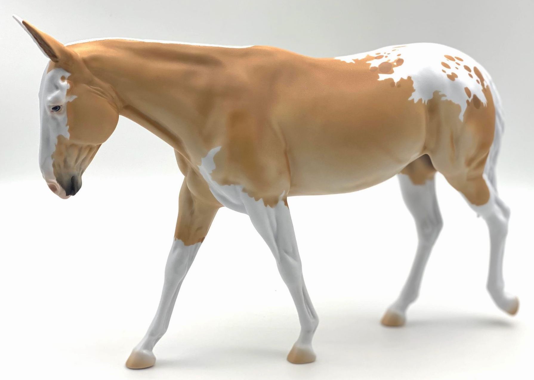 ECLIPSE - Limited Edition of 38, Loyalty Member Release, Black Friday 2021. First Release on the Mule mold. Gambler's Choice - either the Palomino or the Roan would be shipped randomly. Paint job designed by Lindsey Fiscus, and was initially intended to be a palomino on one side and roan on the other, representing both the sun and moon. "This gal is a little funky! She is half blue roan and half palomino, both sides with a fun splash pintaloosa pattern! She has a sun and a moon on either shoulder, to represent what both sides of her mean. I really wanted to represent how two opposites can come together to make something beautiful, whether it be the sun and the moon, or a horse and a donkey! Thank you so much for this amazing chance, I had so much fun!"