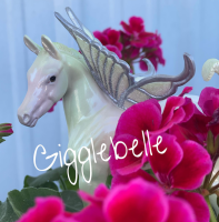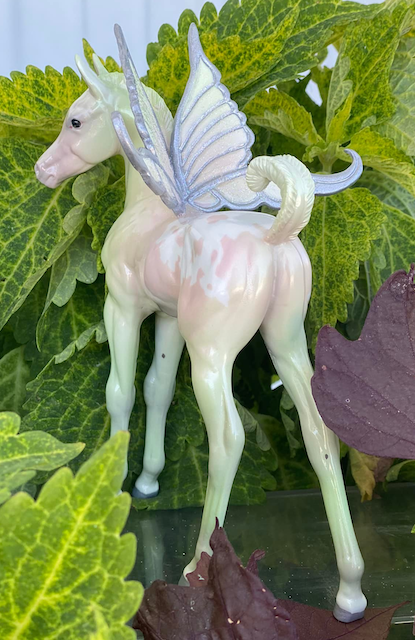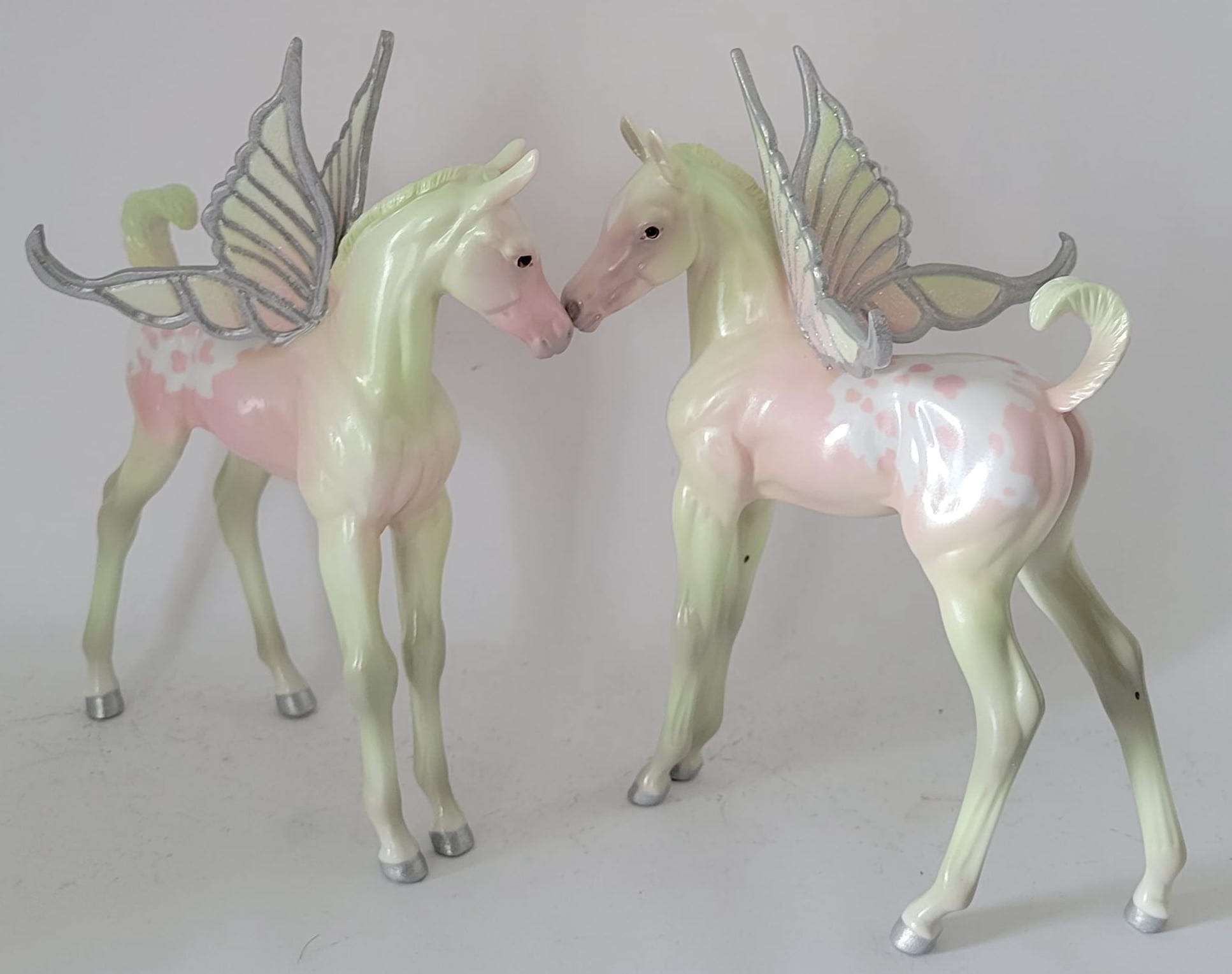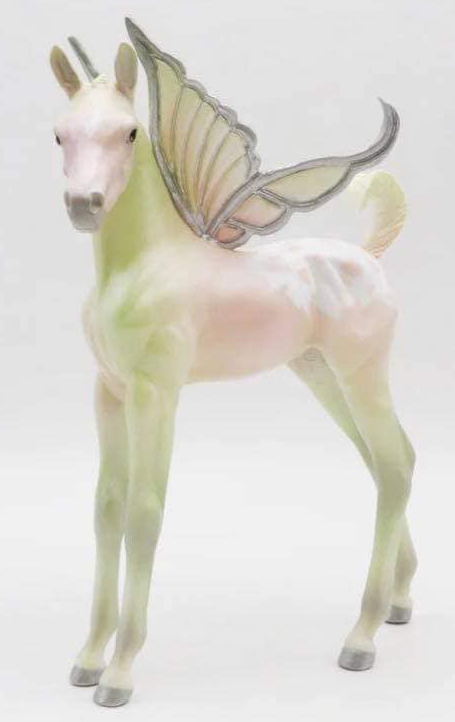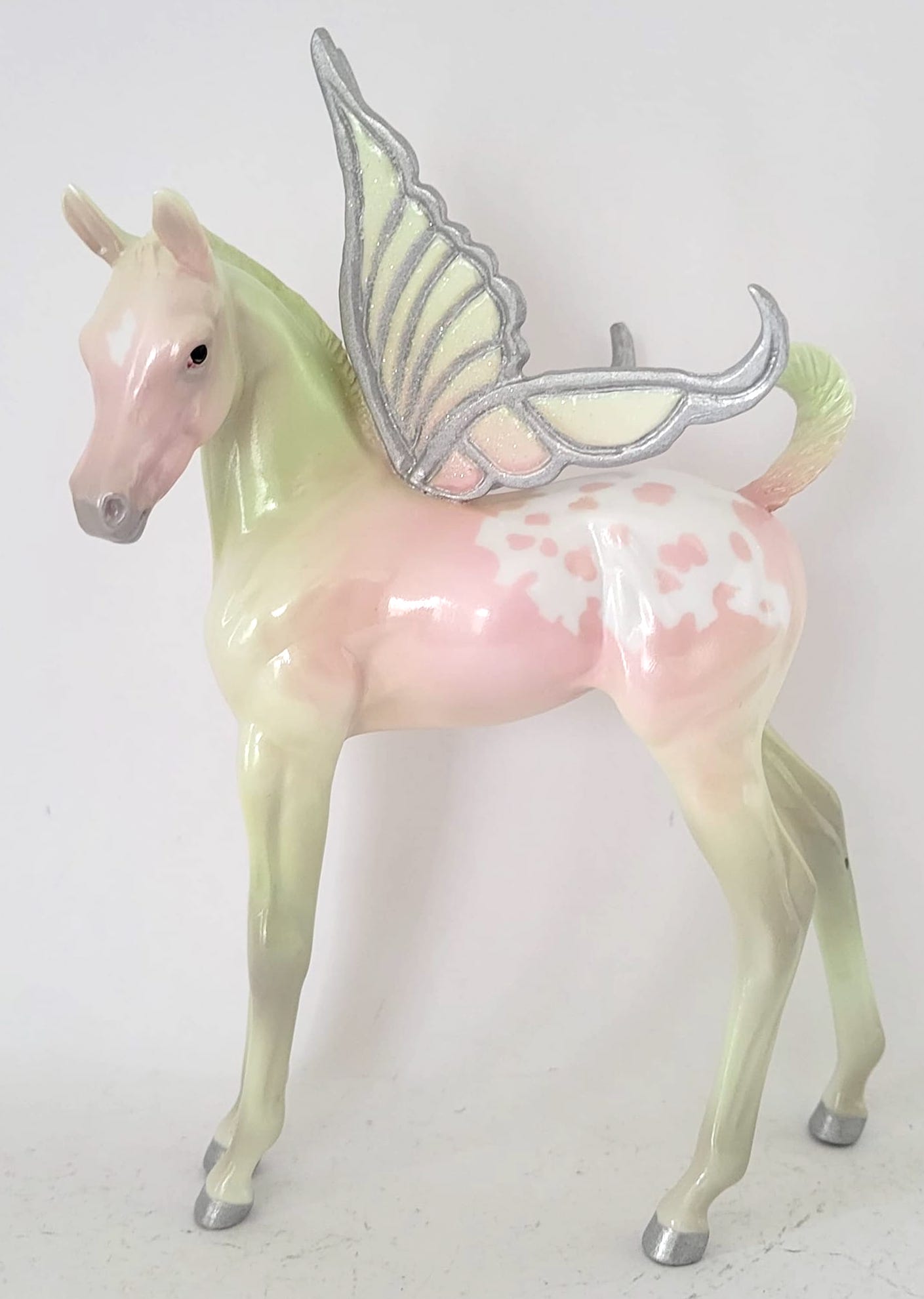 Gigglebelle - Limited Edition of 15, Pastel Pink and Green Fairy Foal with added Shimmer, Carved Wings, Painted by Jess Hamill, Glossy Finish. Winners from the Virtual Treasure Hunt had the option to purchase this model for $290 (out of all the winners, only 15 names were drawn). Models have glow in the dark glitter paint on the wings.