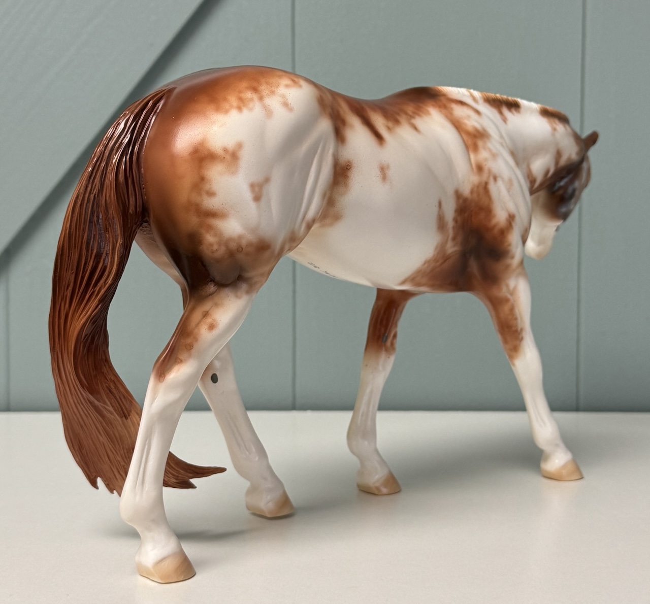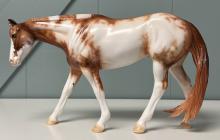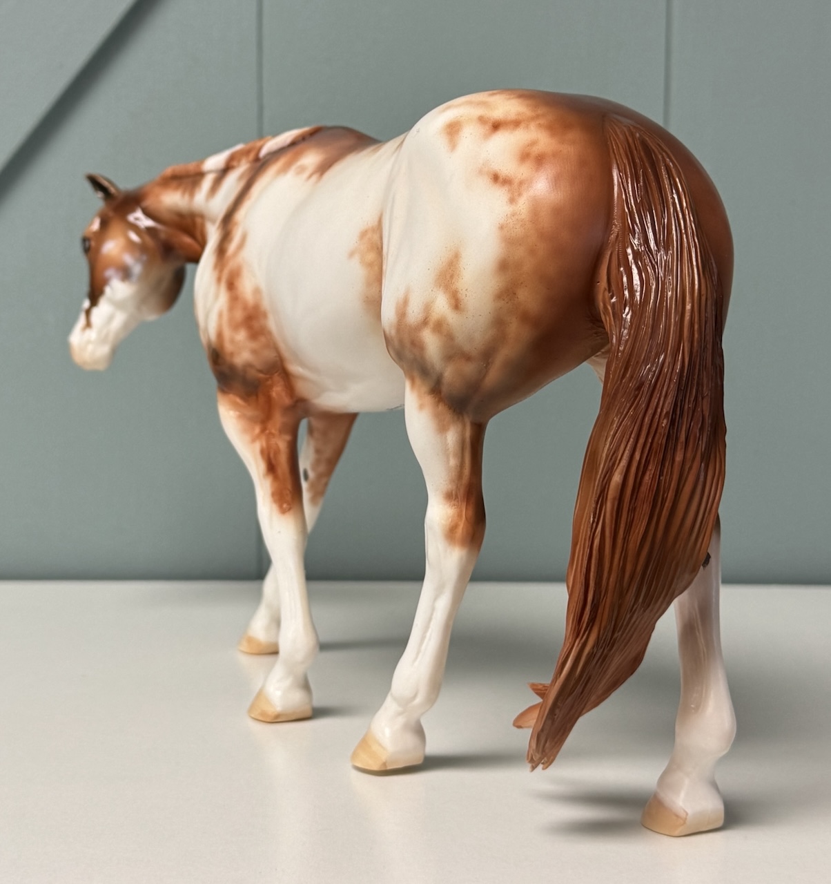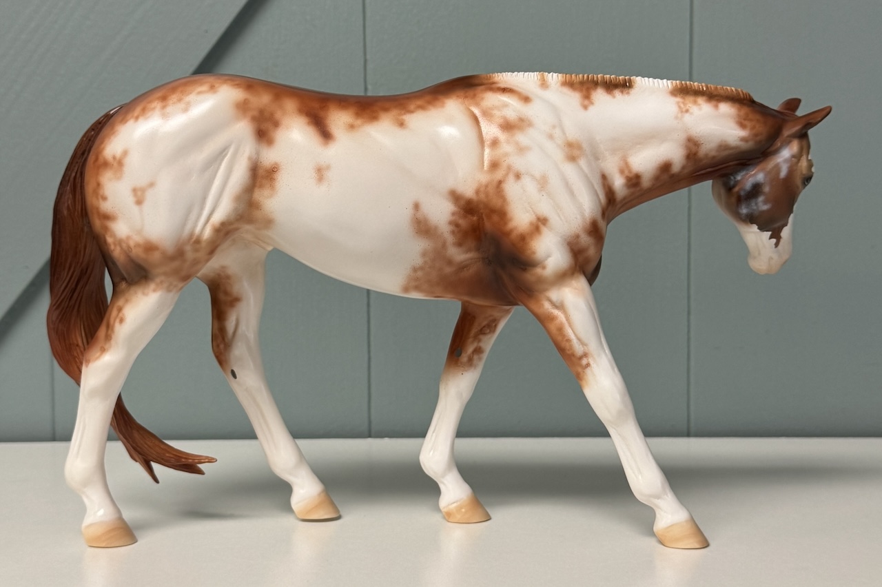 Best Friends - OOAK Chestnut Pinto Western Pleasure Horse, Custom Pleasure Horse Tail and Turned Head, Customized by Mona, Painted by Dawn Quick. Based on Art by Carrie Sloan Meyer, for Art of the Horse 2024. Equilocity Online Auction with Reserve of $750.