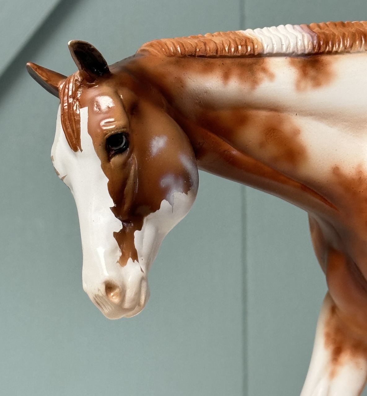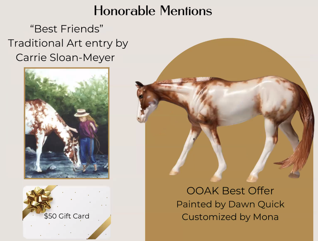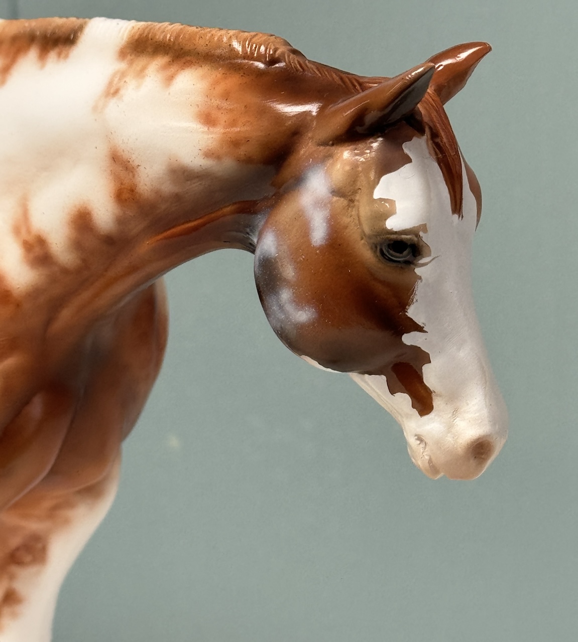 Best Friends - OOAK Chestnut Pinto Western Pleasure Horse, Custom Pleasure Horse Tail and Turned Head, Customized by Mona, Painted by Dawn Quick. Based on Art by Carrie Sloan Meyer, for Art of the Horse 2024. Equilocity Online Auction with Reserve of $750.