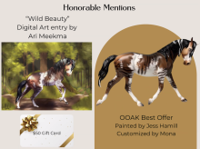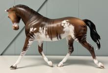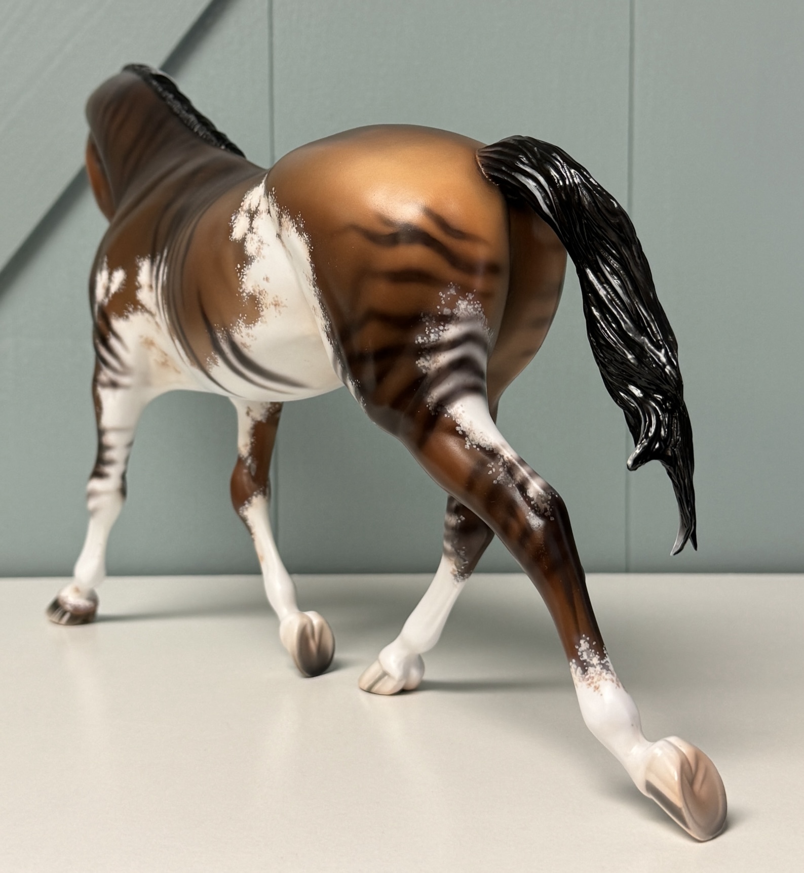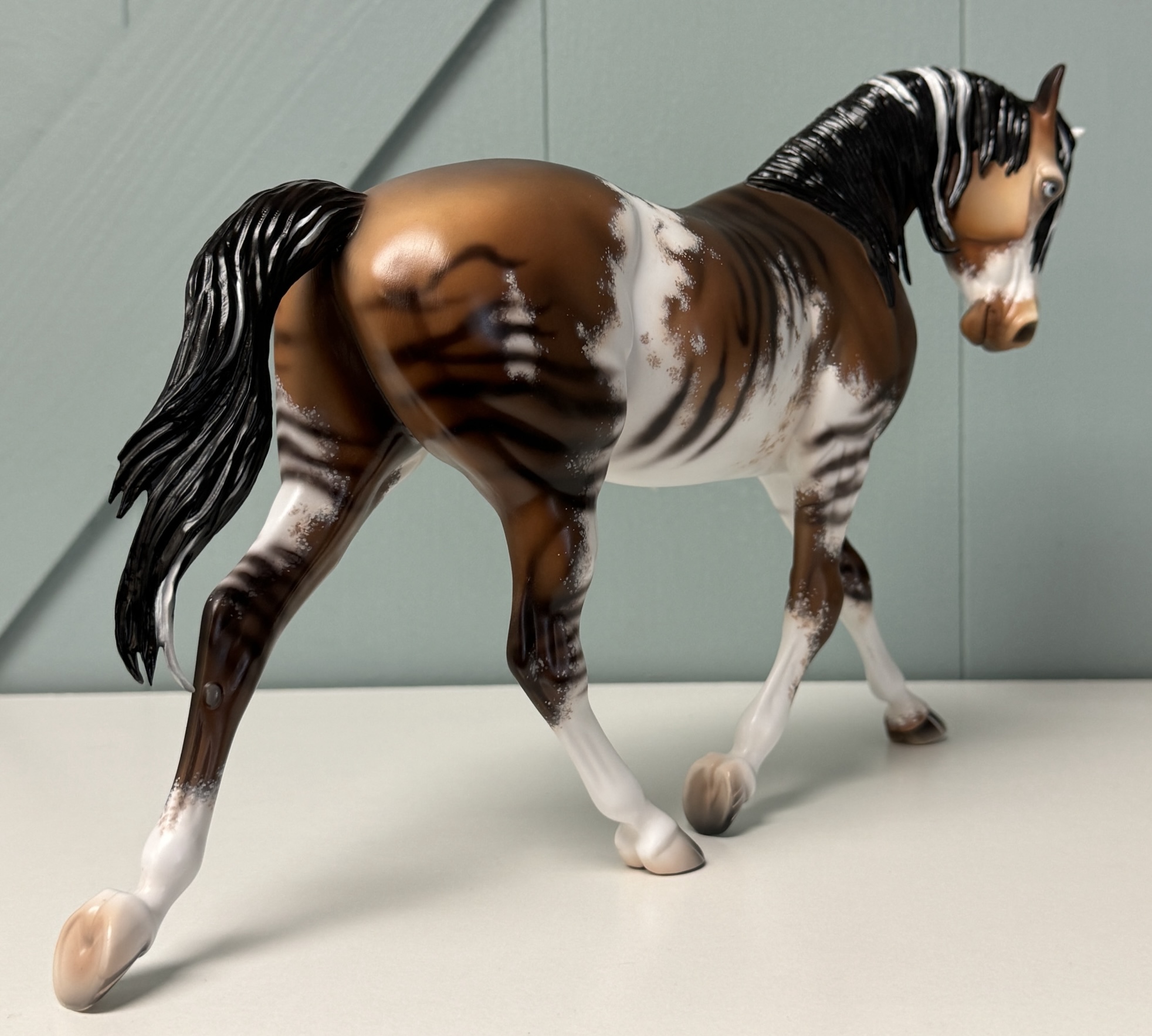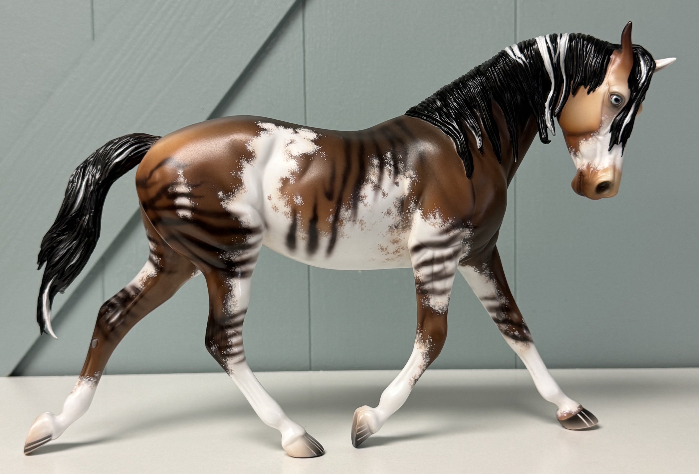 Wild Beauty - OOAK Hybrid Zebra Pinto Palouse, Custom Head Tuck, Custom Mane, Tail and Forelock, Customized by Mona, Painted by Jess Hamill. Based on Art by Ari Meekma, for Art of the Horse 2024. Equilocity Online Auction with Reserve of $950.