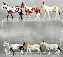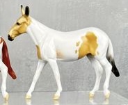 This series of Mules consists of 5 OOAK models painted by Dawn Quick and Julie Keim. Colors included Buckskin Tobiano, Roan Splash Pinto, Rose Grey Pinto, Bay Overo, and Chestnut Tobiano. The Grulla Pinto pictured will be offered later.